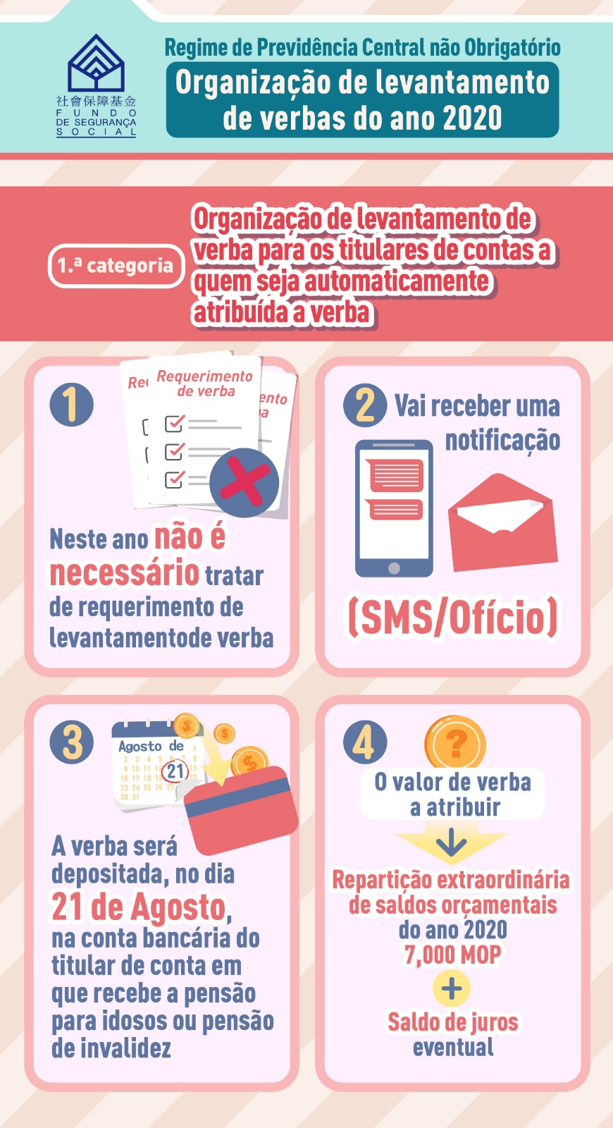 No final de Julho, o FSS vai, conforme a vontade dos idosos expressada na inscrição, emitir uma notificação por SMS ou ofício e, no dia 21 de Agosto, será creditada automaticamente a verba a título de repartição extraordinária de saldos orçamentais deste ano no valor de 7 000 patacas juntamente os juros eventuais na conta bancária em que recebem a pensão para idosos ou pensão de invalidez. Se necessário, os idosos podem também consultar se preenchem os requisitos de atribuição automática de verbas através dos quiosques automáticos ou da página electrónica www.fss.gov.mo/pt/eservice/r4.