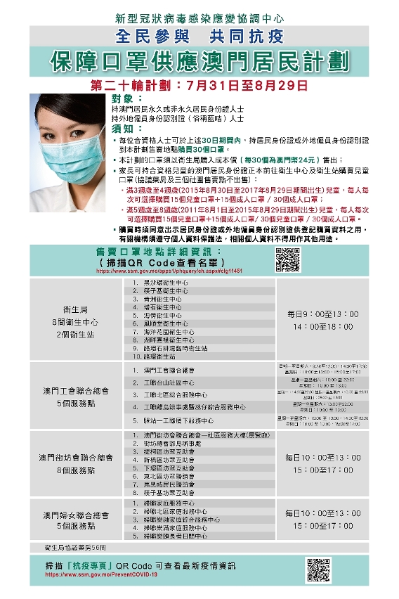 O Centro de Coordenação de Contingência do Novo Tipo de Coronavírus anunciou quarta-feira (dia 29) que na próximas sexta-feira, 31 de Julho, terá inicio o 20.º plano de fornecimento de máscaras aos residentes de Macau.