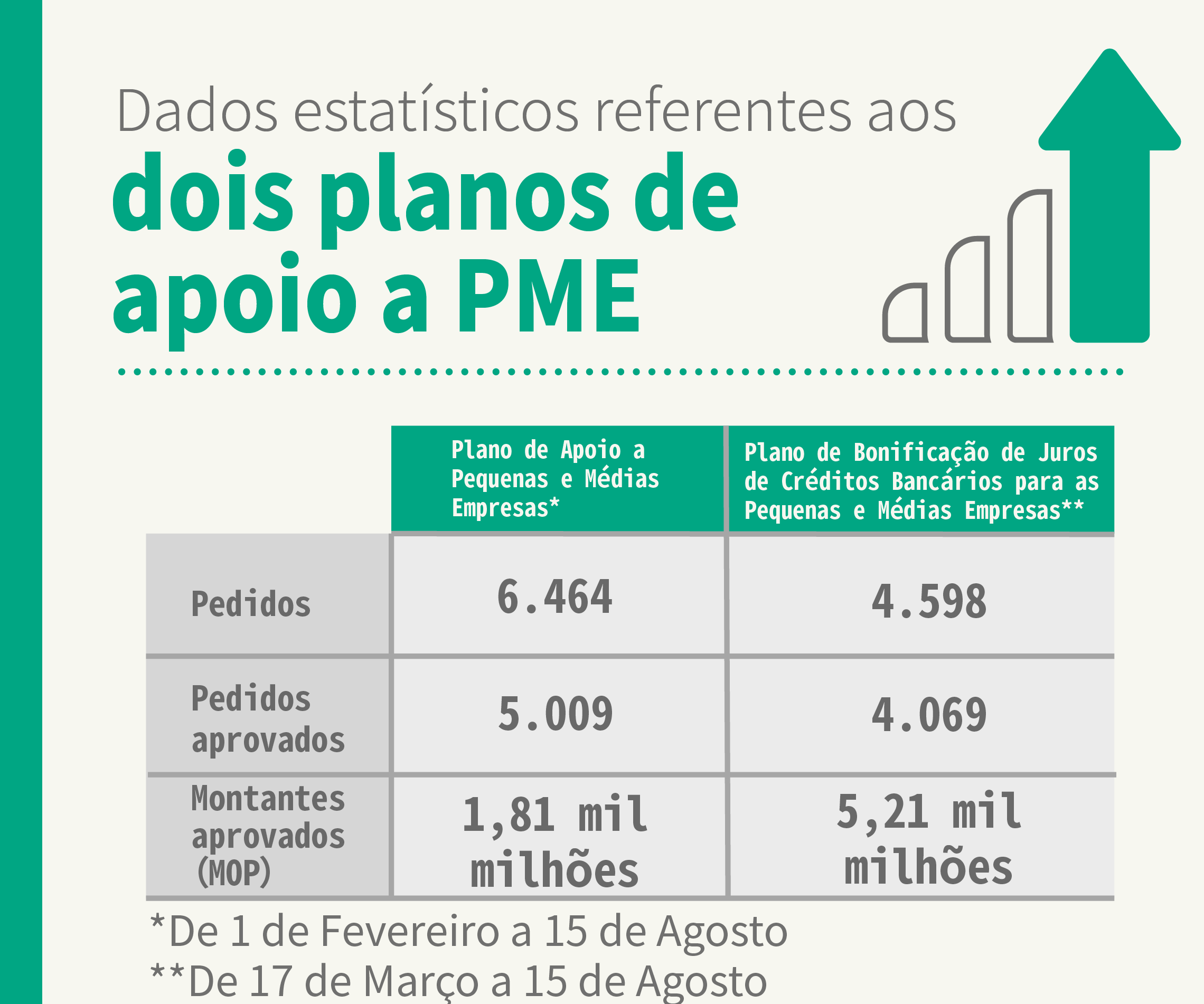 Desde 1 de Fevereiro até 15 de Agosto, foram recebidos um total de 11 000 pedidos do Plano de Apoio a Pequenas e Médias Empresas e do Plano de Bonificação de Juros de Créditos Bancários para as Pequenas e Médias Empresas, dos quais mais de 80% forma aprovados, tendo sido injectado nas pequenas e médias empresas capital circulante no valor de mais de 7 000 milhões de patacas (incluindo empréstimos do Governo no valor de 1 810 milhões de patacas e créditos bancários no valor de 5 210 milhões de patacas).