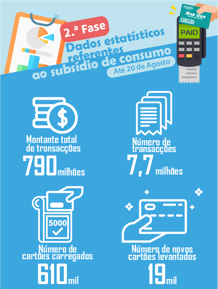 O cartão de consumo da 2ª fase começou a ser utilizado a partir do dia 1 de Agosto. Até 20 de Agosto, mais de 610 mil cartões de consumo já foram carregados, ocupando 98% dos cartões levantados na 1ª fase (624 mil cartões), e com os mais de 19 mil novos cartões levantados, cerca de 630 mil residentes já receberam o subsídio de consumo da 2ª fase.