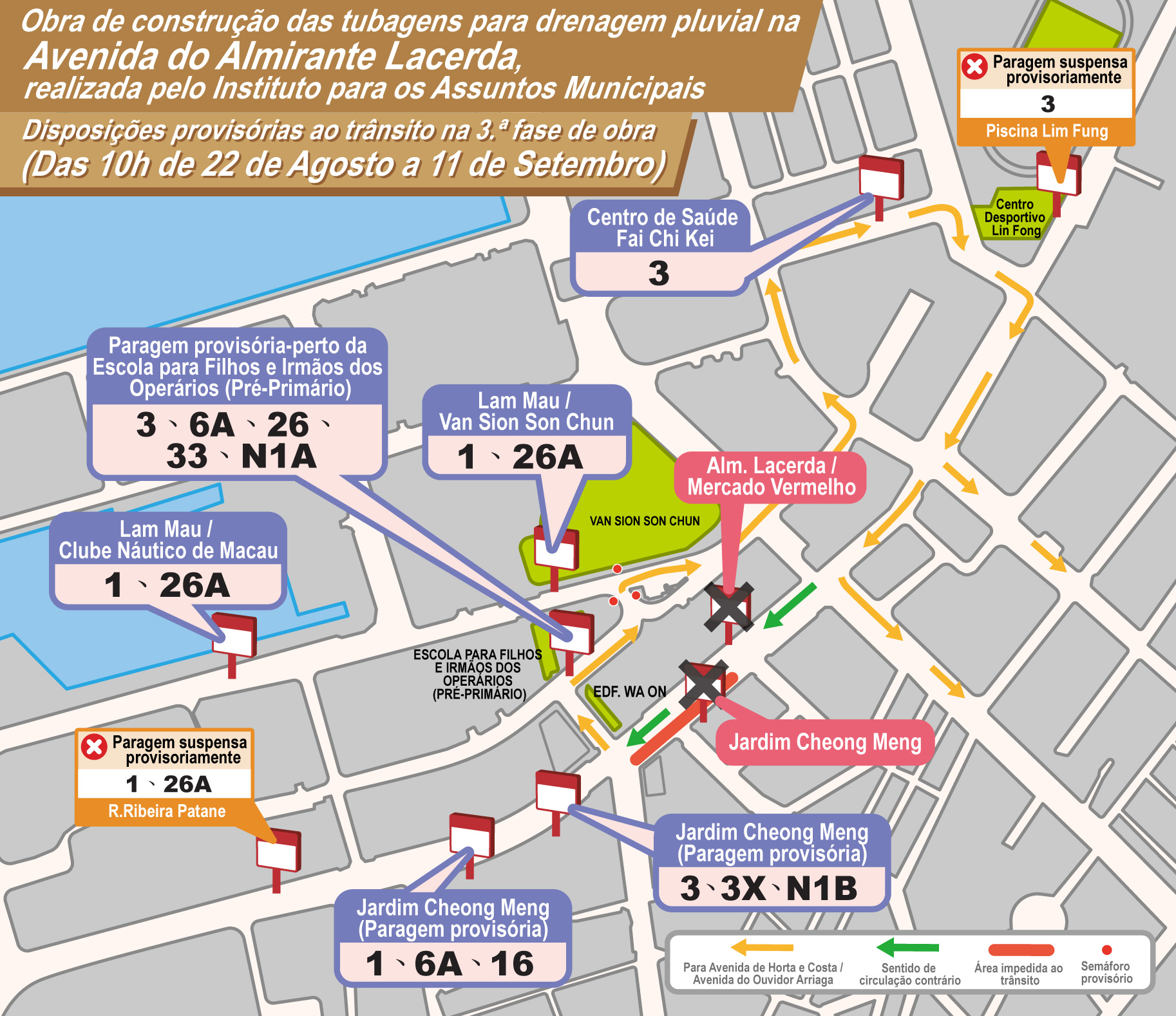 O Instituto para os Assuntos Municipais (IAM) continuará a obra de construção das tubagens para a drenagem pluvial na Avenida do Almirante Lacerda. A 3.ª fase da obra começará a partir das 10h do dia 22 de Agosto (Sábado) e impedirá a circulação nas vias da Avenida do Almirante Lacerda junto ao troço entre a Estrada do Repouso e a Rua de Tomé Pires (em direcção à Rua da Ribeira do Patane). O trânsito circulará em sentido contrário na Avenida do Almirante Lacerda junto ao troço entre a Travessa do Almirante Lacerda e a Rua Sul do Patane (em direcção à Avenida de Horta e Costa), permitindo assim a circulação de veículos até a Rua da Ribeira do Patane. Será ainda implementado um controlo provisório ao trânsito na Rua de Brás da Rosa, na Travessa do Bem-Estar e na Rua de Tomé Pires, estando previsto que a presente fase da obra termine no dia 11 de Setembro (Sexta-feira).