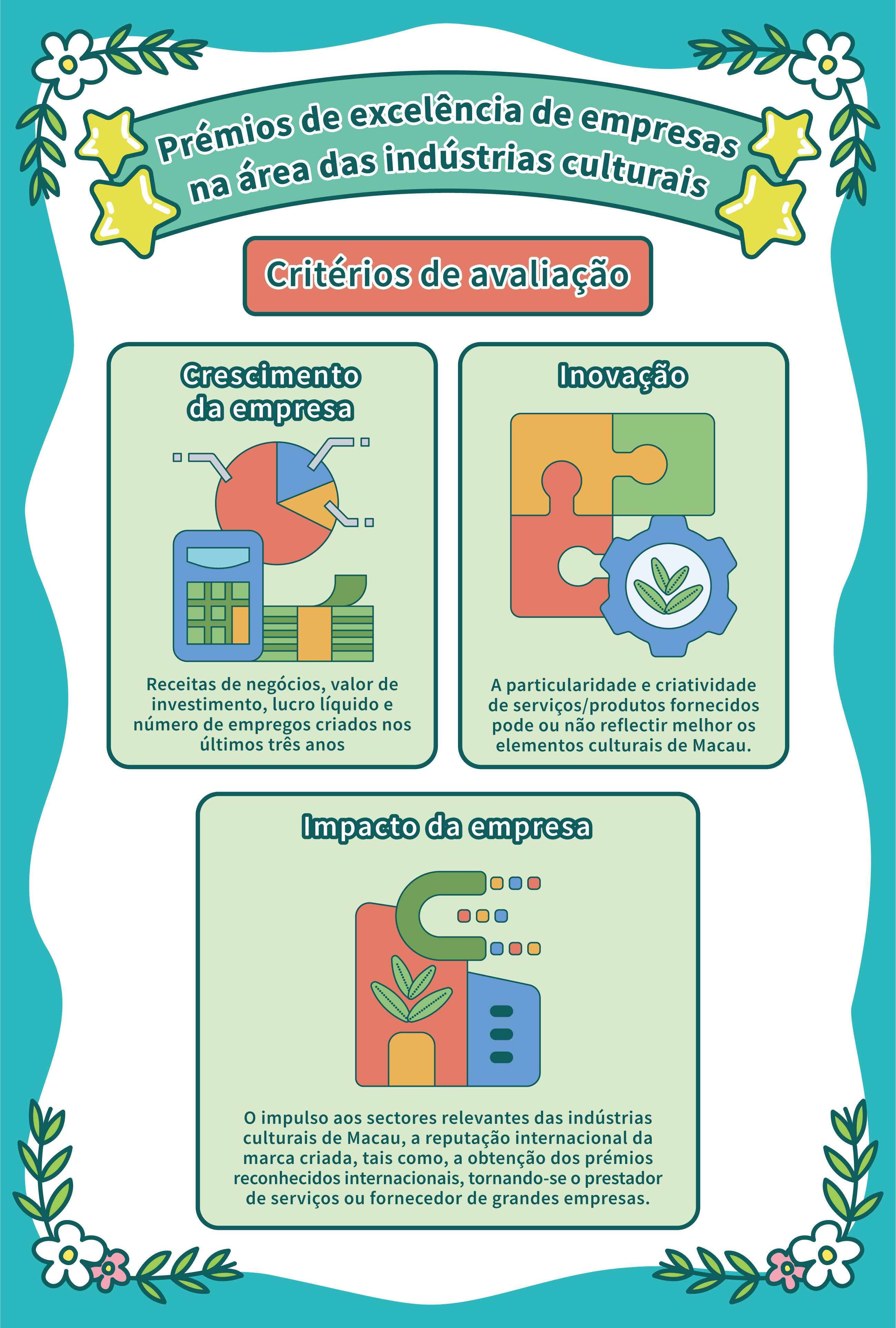 Os “Prémios de excelência de empresas” para a área de design criativo, visam premiar as empresas nesta área que tenham melhor capacidade relativa às operações financeiras e industrialização. Enquanto os “Prémios de excelência de projectos” para a área de exposições e espectáculos culturais, visam premiar os projectos desta área com maior potencialidade de desenvolvimento no mercado, conseguindo promover a marca de Macau. As empresas candidatas dos “Prémios de excelência de empresas” devem pertencer à área de design criativo e ser constituídas antes ou até 31 de Dezembro de 2016, com a operação contínua durante 2017-2019. Os candidatos-alvos dos “Prémios de excelência de projectos” da área de exposições e espectáculos culturais incluem empresas, personalidades ou associações, cujos projectos candidatos devem ser os mesmos espectáculos, realizados pelo menos 5 vezes entre os anos de 2017 e 2019, com a venda de bilhetes ao público.