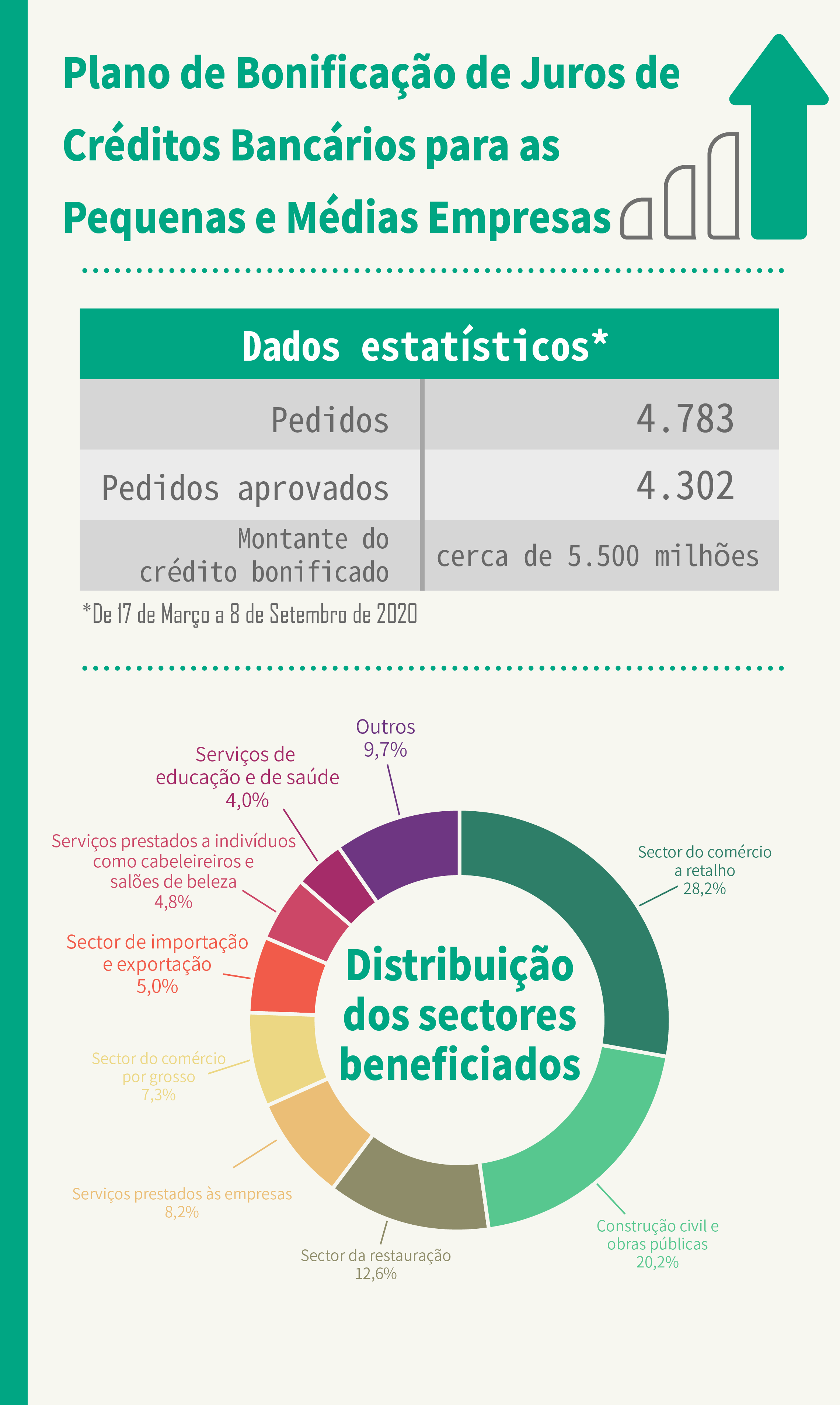 Desde o lançamento do Plano, em 17 de Março, até 8 de Setembro, foram recebidos 4.783 pedidos, dos quais 4.302 foram aprovados (cerca de 90%). O montante dos créditos bonificados foi cerca de 5 500 milhões de patacas, envolvendo uma bonificação de juros no valor de cerca de 340 milhões de patacas.