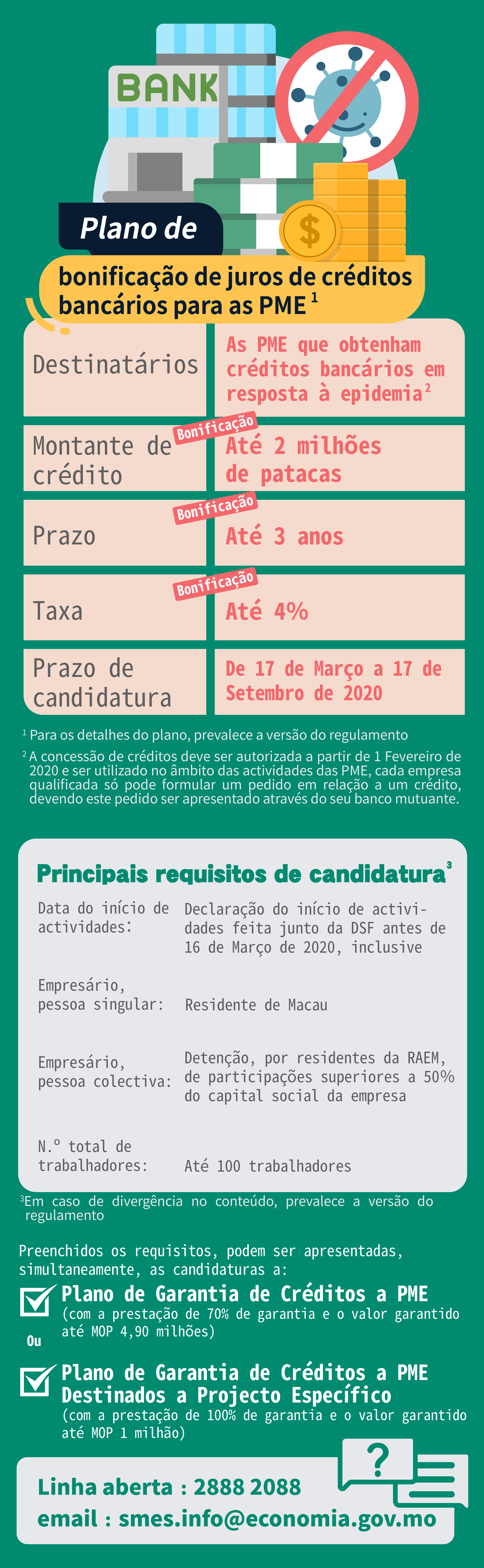 Face ao impacto na economia provocado pela Pneumonia causada pelo novo tipo de coronavírus, o Governo da RAEM lançou o Plano de Bonificação de Juros de Créditos Bancários para as Pequenas e Médias Empresas, no sentido de conceder às PME qualificadas, que tenham acesso ao empréstimo concedido pelo banco para dar resposta à epidemia, um crédito no montante máximo de 2 milhões de patacas, com a bonificação de juros até 4% e com o prazo máximo de bonificação de 3 anos. O Plano contribui para aumentar a liquidez das PME, e, ao mesmo tempo, reduzir eficazmente os respectivos encargos com juros.