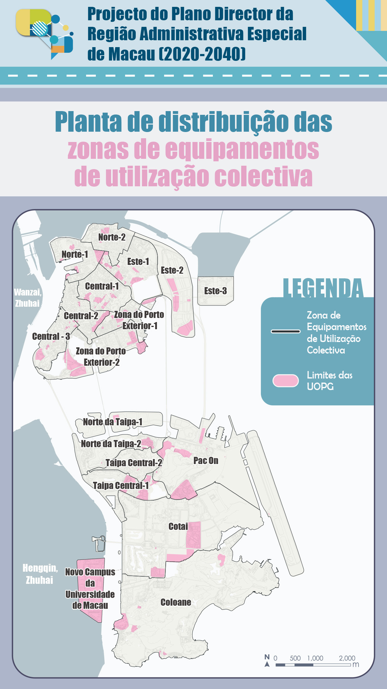 Deste modo, no projecto do “Plano Director da Região Administrativa Especial de Macau (2020-2040)” foi proposta a optimização da disposição dos equipamentos de utilização colectiva de Macau e a delimitação das respectivas zonas de equipamentos ocupando cada um deles um terreno. Além de manter as actuais zonas de equipamentos de utilização colectiva que estão concentradas nas UOPG Pac On, UOPG Cotai e UOPG Novo Campus da Universidade de Macau, serão criadas mais zonas nas UOPG Norte–1, UOPG Este–2, UOPG Zona do Porto Exterior–2, UOPG Norte da Taipa–1 e UOPG Coloane. Relativamente aos equipamentos comunitários de utilização colectiva, serão definidos concretamente na fase do plano de pormenor com base no número de população da respectiva zona e nas necessidades reais dos serviços, nos requisitos orientadores constantes do Plano Director e nos respectivos critérios de cada um dos serviços competentes.