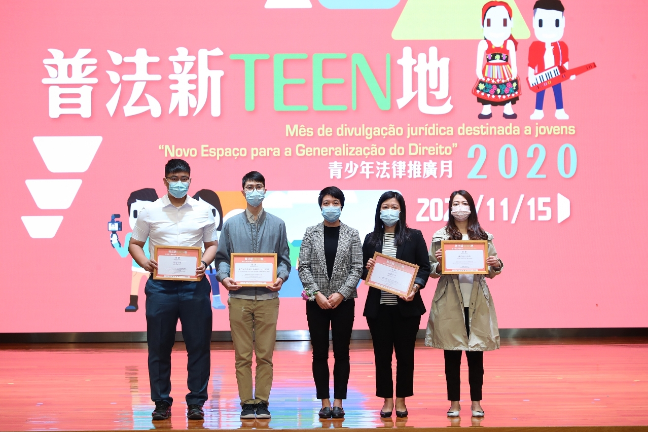 De modo a procederem à continuação da promoção dos trabalhos de divulgação das leis e ao balanço dos resultados das actividades, os serviços, acima mencionados, realizaram, no dia 15 de Novembro, no auditório da Escola da Associação Geral das Mulheres de Macau, a sessão de encerramento e cerimónia de entrega dos prémios do mês da divulgação jurídica destinada a jovens, no âmbito da actividade “Novo Espaço para a Generalização do Direito”, com a participação dos seguintes convidados: Adjunta do Comandante-geral dos Serviços de Polícia Unitários, Lao Wan Seong, Subdirector da DSEJ, Kong Chi Meng, Subdirectora da DSAJ, Leong Pou Ieng, Vice-presidente do IC, Leong Wai Man, Chefe do Departamento de Juventude da DSEJ, Cheong Man Fai, Chefe do Departamento de Prevenção e Tratamento da Dependência do Jogo e da Droga do IAS, Cheang Io Tat, Chefe da Divisão de Ligação entre Polícia e Comunidade e Relações Públicas da PJ, Cheang Pou Seong, Subintendente da Divisão de Relações Públicas do CPSP, Lei Tak Fai, Chefe da Divisão de Educação Cívica do Instituto para os Assuntos Municipais, Lam Mei Sio, Chefe da Divisão de Apoio aos Estudantes das Instituições do Ensino Superior da Direcção dos Serviços do Ensino Superior, Vong Iut Peng, Chefe Substituta da Divisão de Licenciamento e de Apoio Técnico da DSAL, Lam Pui Heng, Chefe Substituta da Divisão de Relações Públicas da DSAJ, Wong Ka Wai, Chefe Assistente do Departamento de Estudo e Planeamento do Corpo de Bombeiros, Lei Chi Hou, vogais do Conselho de Juventude e ainda representantes de escolas e instituições participantes.