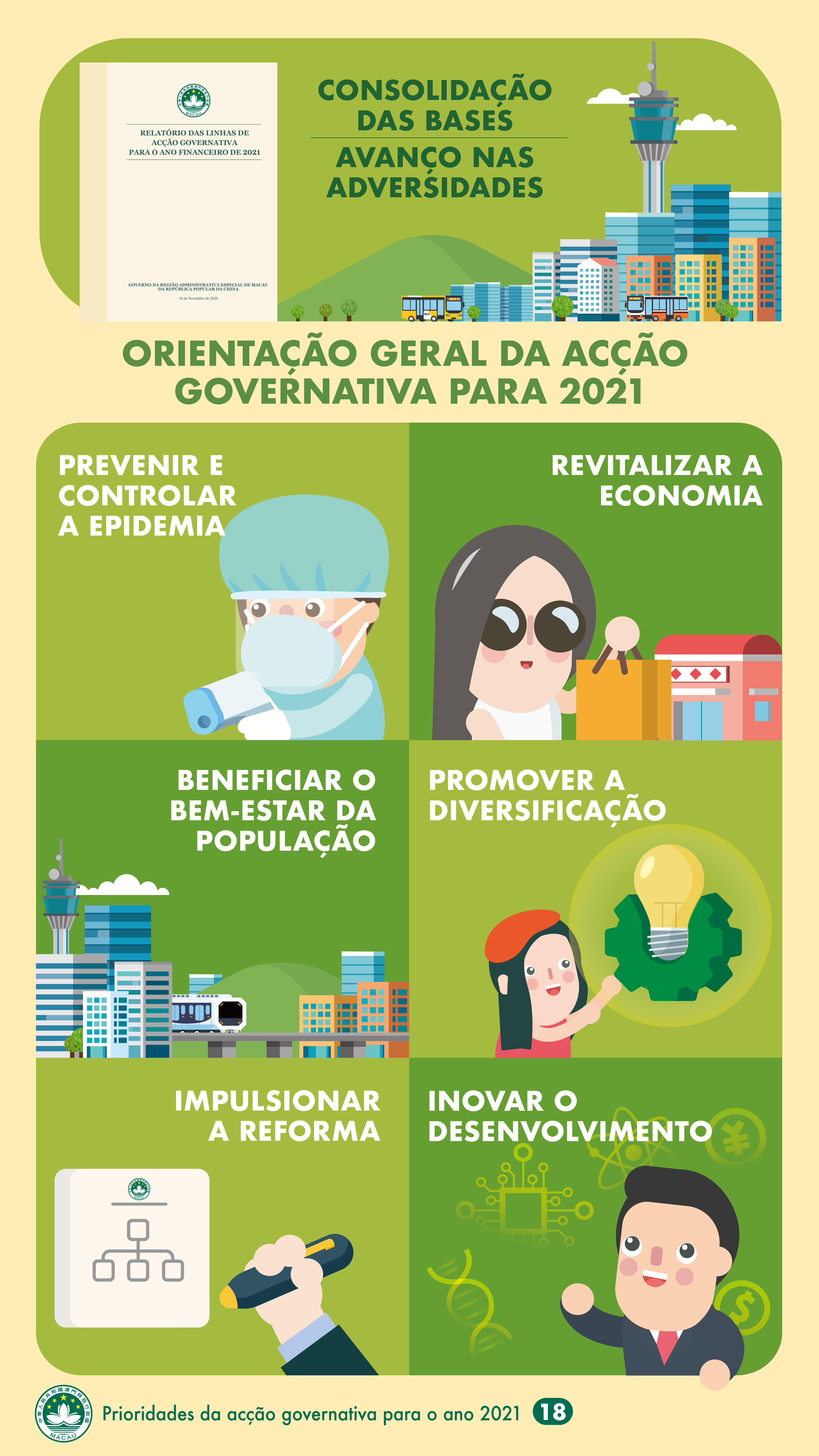 • Orientação geral da acção governativa para 2021: Consolidação das Bases, Avanço nas Adversidades, Prevenir e controlar a epidemia, revitalizar a economia, beneficiar o bem-estar da população, promover a diversificação, impulsionar a reforma, inovar o desenvolvimento