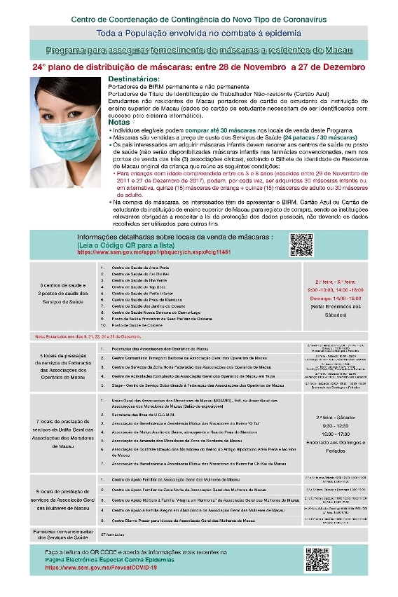 O Centro de Coordenação de Contingência do Novo Tipo de Coronavírus informa que a partir de sábado, 28 de Novembro, terá início o 24.º plano de fornecimento de máscaras aos residentes de Macau.