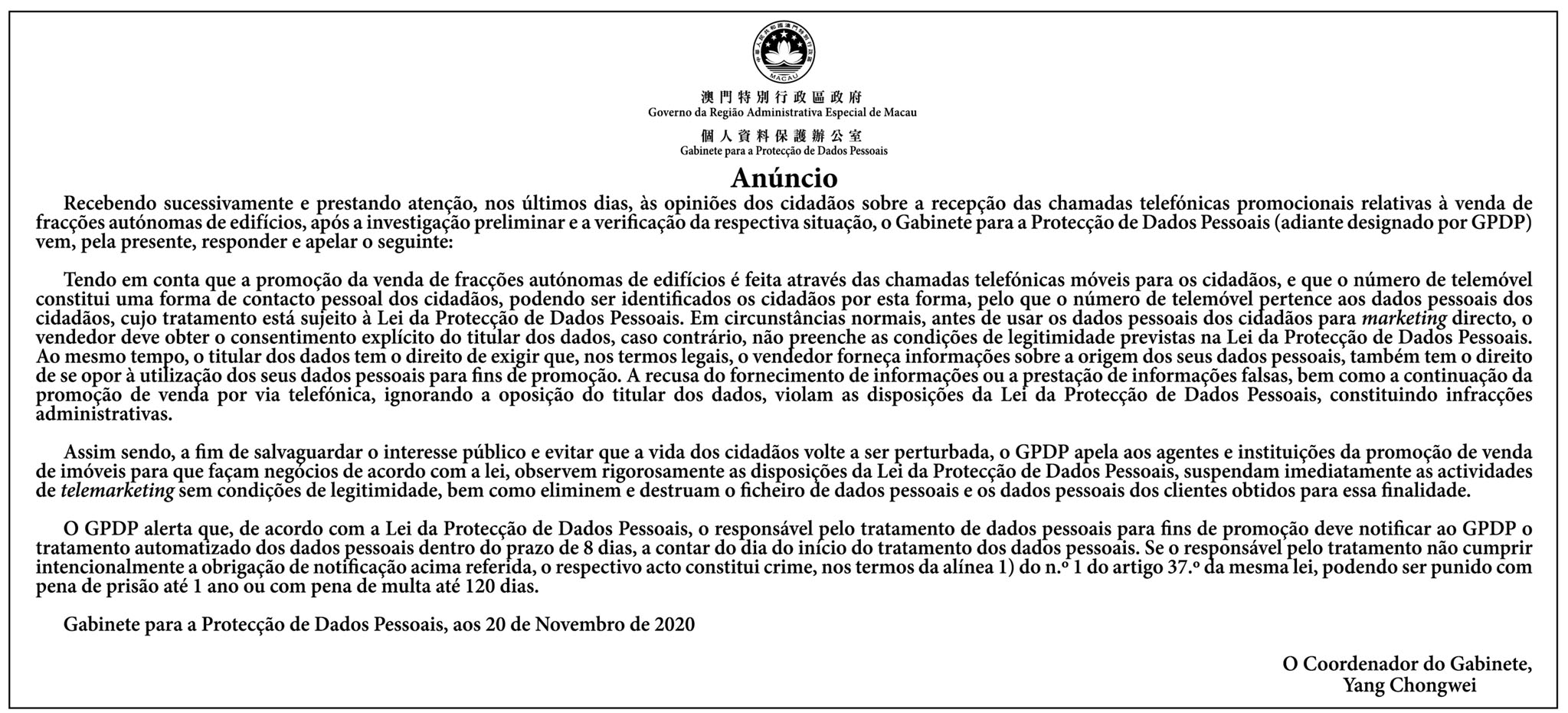 Par além disso, o GPDP descobriu recentemente que outros sectores estão a utilizar práticas ilegais semelhantes na promoção comercial por telefone. O GPDP alerta as entidades de todos os sectores de actividades para respeitarem os direitos do titular dos dados pessoais e suspenderem todas as actividades de telemarketing que violem a Lei da Protecção de Dados Pessoais, sob pena de serem responsabilizadas legalmente.