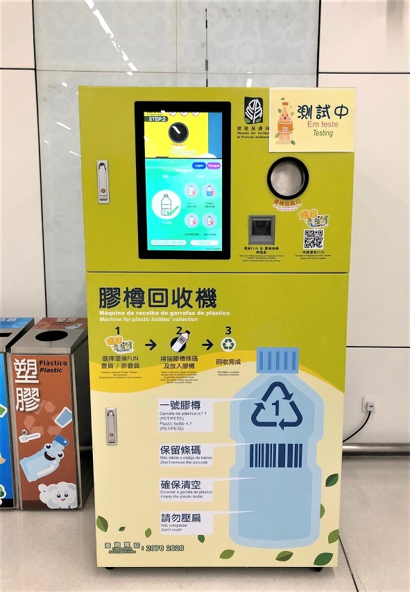 A Direcção dos Serviços de Protecção Ambiental (DSPA) instalou, pela primeira vez, as máquinas de recolha de garrafas de plástico em Outubro do ano passado, e estas são cada vez mais utilizadas pelos cidadãos, tendo sido recolhidos até ao momento mais de 74.000 garrafas de plástico. Por forma a facilitar ainda mais a prática de reciclagem por parte dos residentes, até Novembro do ano corrente, foram instaladas mais 32 máquinas em algumas instalações desportivas, nas estações do Metro Ligeiro e nos postos de migração, sendo agora disponibilizadas 42 máquinas de recolha de garrafas de plástico.