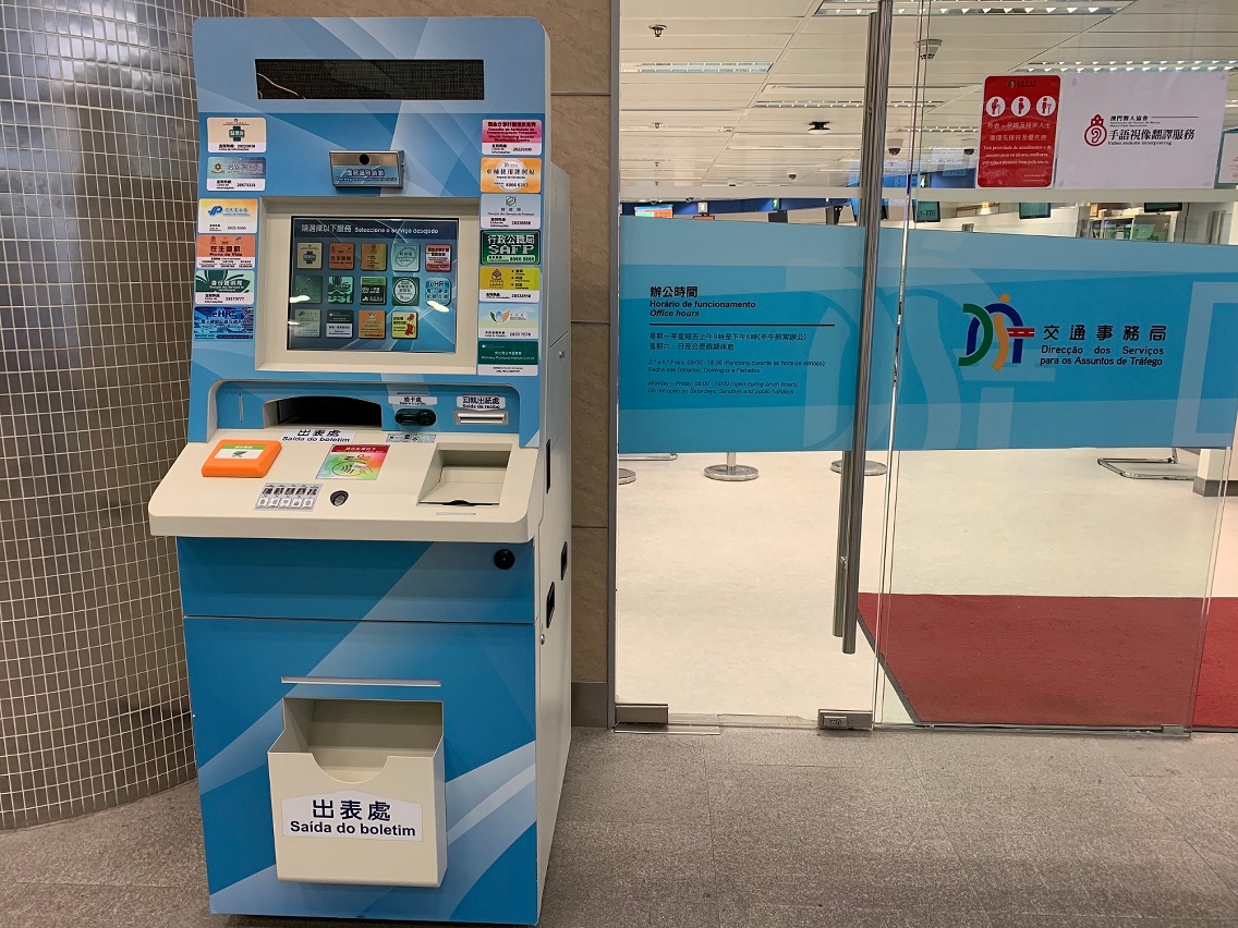 Os cidadãos podem ainda optar pelo pagamento electrónico no website “epay” da DSAT ou através da aplicação móvel “Posto de Informação de Tráfego”. O pagamento pode também ser efectuado por cartão porta-moedas (Macau Pass) ou “Mpay” (com o valor máximo de transacção de mil patacas) através dos 25 quiosques de serviços de auto-atendimento, procedendo-se à impressão imediata do dístico (Localização dos quiosques constante no website da Direcção dos Serviços de Identificação: http://www.dsi.gov.mo/kiosk_other_c.jsp).