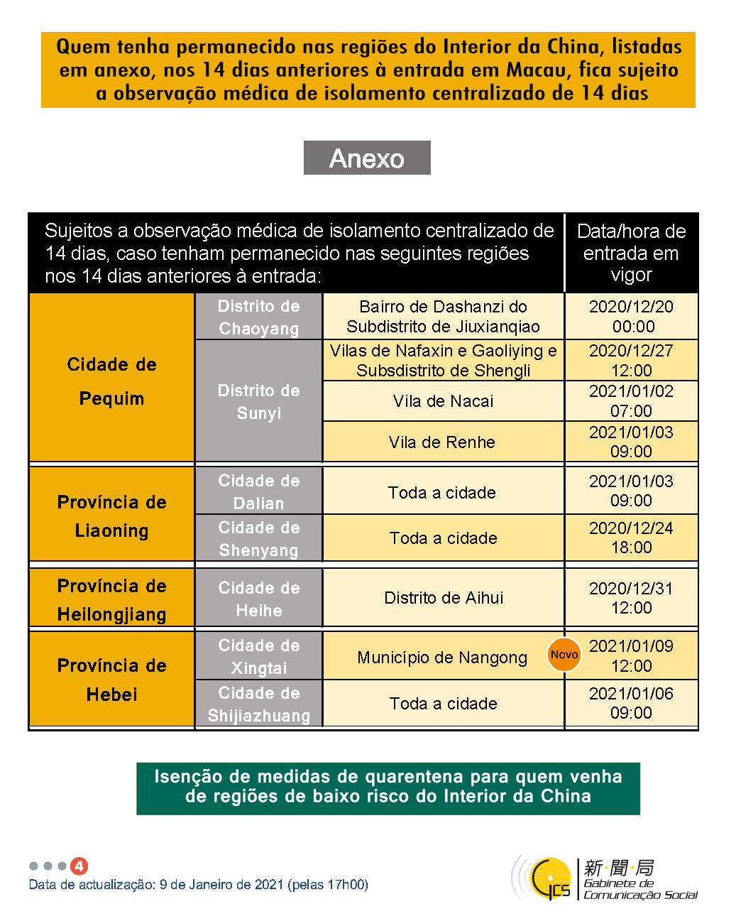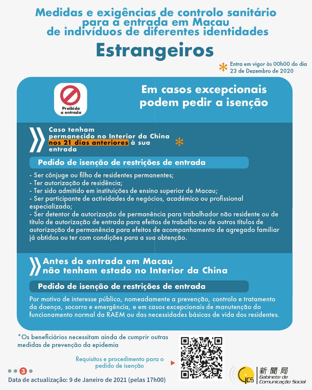(Infografia) Medidas e exigências de controlo sanitário para a entrada em Macau de indivíduos de diferentes identidades, actualizadas no dia 9 de Janeiro de 2021