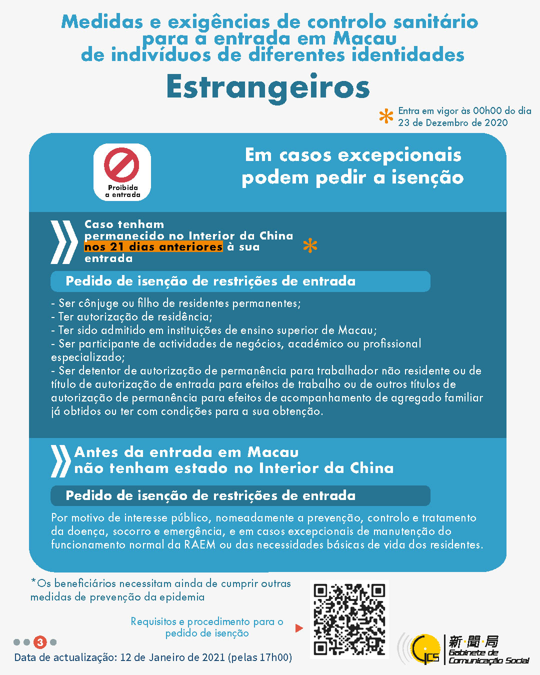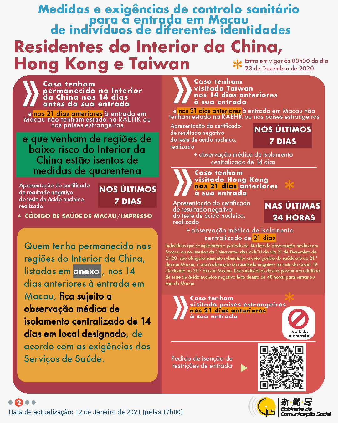 (Infografia) Medidas e exigências de controlo sanitário para a entrada em Macau de indivíduos de diferentes identidades, actualizadas no dia 12 de Janeiro de 2021
