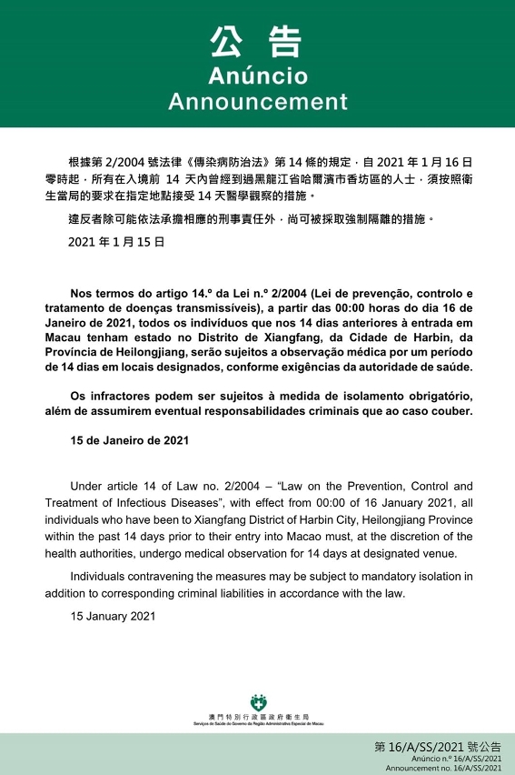 O Centro de Coordenação de Contingência do Novo Tipo de Coronavírus informa que tendo em consideração a evolução epidemiológica mais actualizada na Província de Heilongjiang, nos termos do artigo 14.º da Lei n.º 2/2004 (Lei de prevenção, controlo e tratamento de doenças transmissíveis), a partir das 00:00 horas do dia 16 de Janeiro de 2021, todos os indivíduos que nos 14 dias anteriores à entrada em Macau tenham estado no Distrito de Xiangfang, da Cidade de Harbin, da Província de Heilongjiang, serão sujeitos a observação médica por um período de 14 dias em locais designados, conforme exigências da autoridade de saúde.