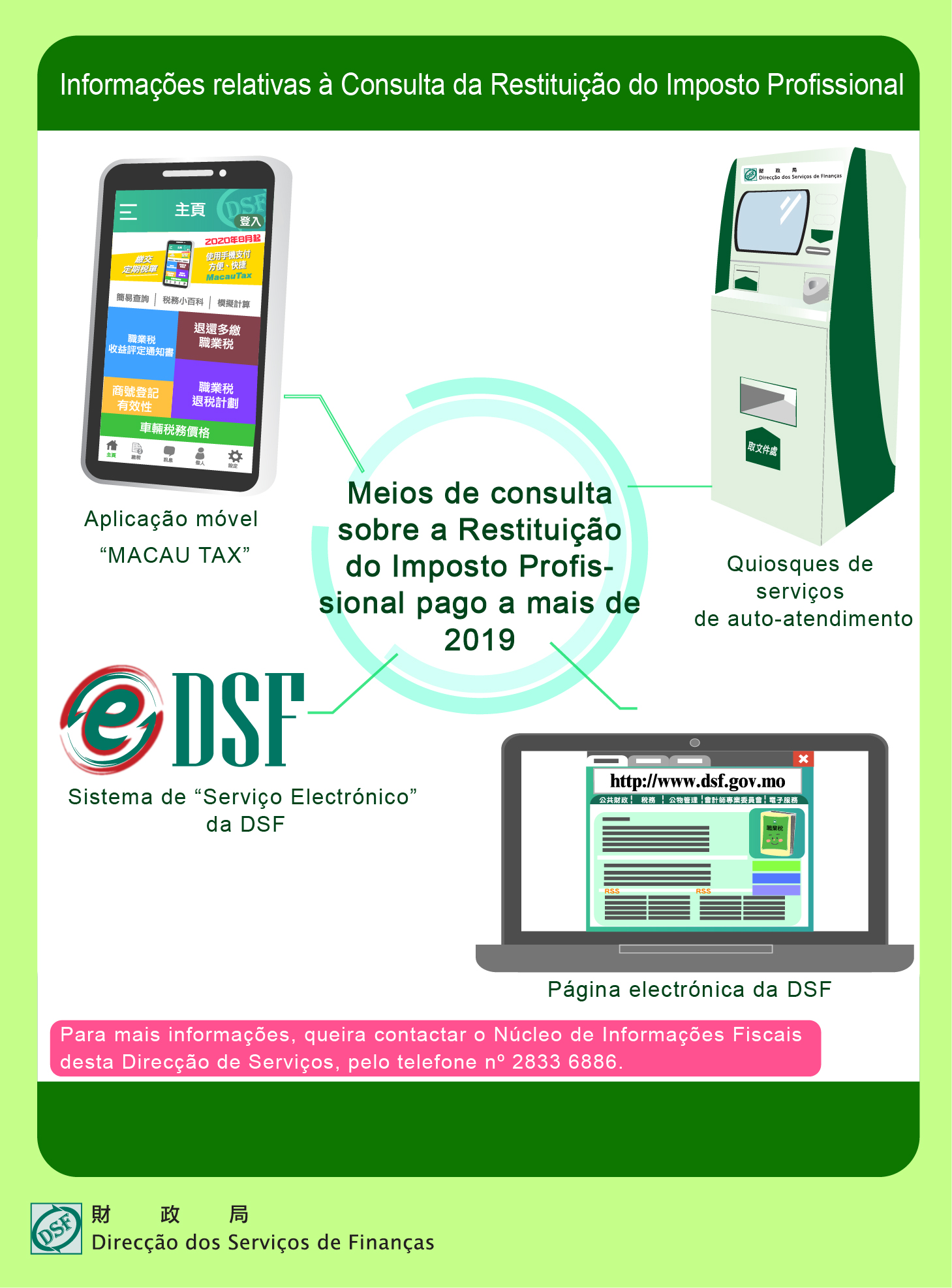 Para mais informações, é favor contactar o Núcleo de Informações Fiscais destes Serviços, pelo telefone n.º 2833 6886.