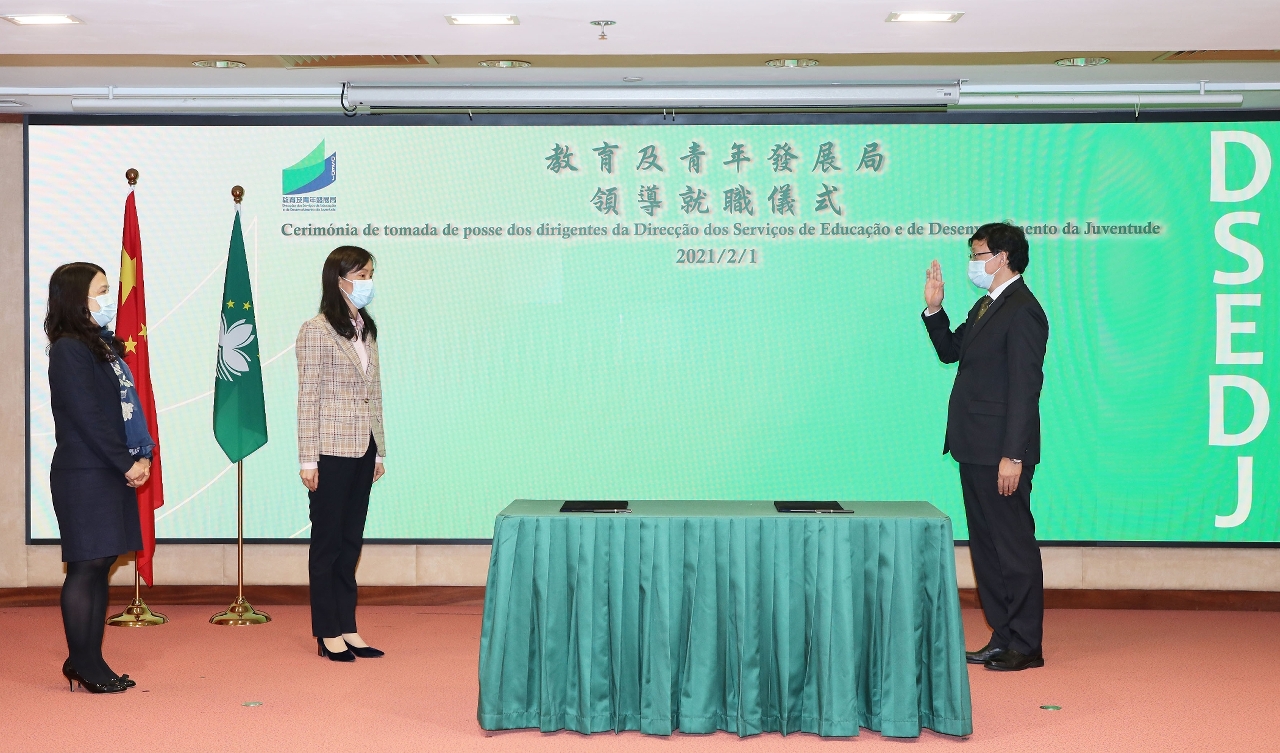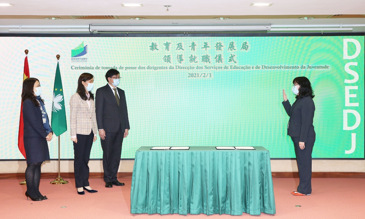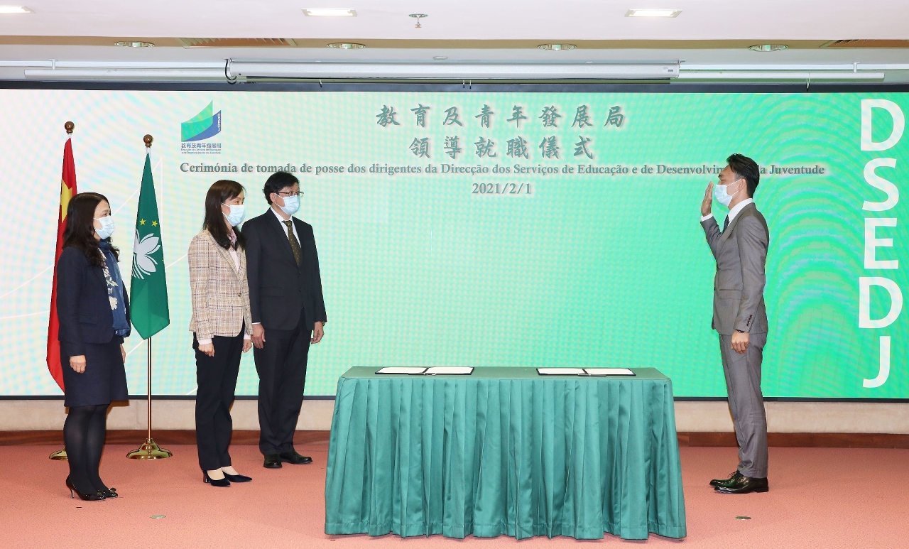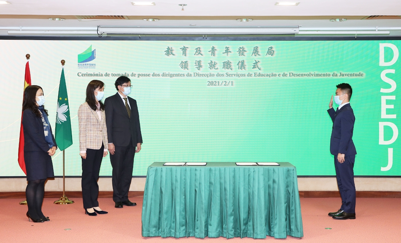 A Direcção dos Serviços de Educação e de Desenvolvimento da Juventude (DSEDJ) foi, oficialmente, estabelecida no dia 1 de Fevereiro, tendo-se realizado a Cerimónia de tomada de posse do Director e Subdirectores. O novo Director, Lou Pak Sang e os Subdirectores, Kong Chi Meng, Teng Sio Hong e Iun Pui Iun, prestaram juramento, perante a Secretária para os Assuntos Sociais e Cultura, Ao Ieong U, e tomaram posse.