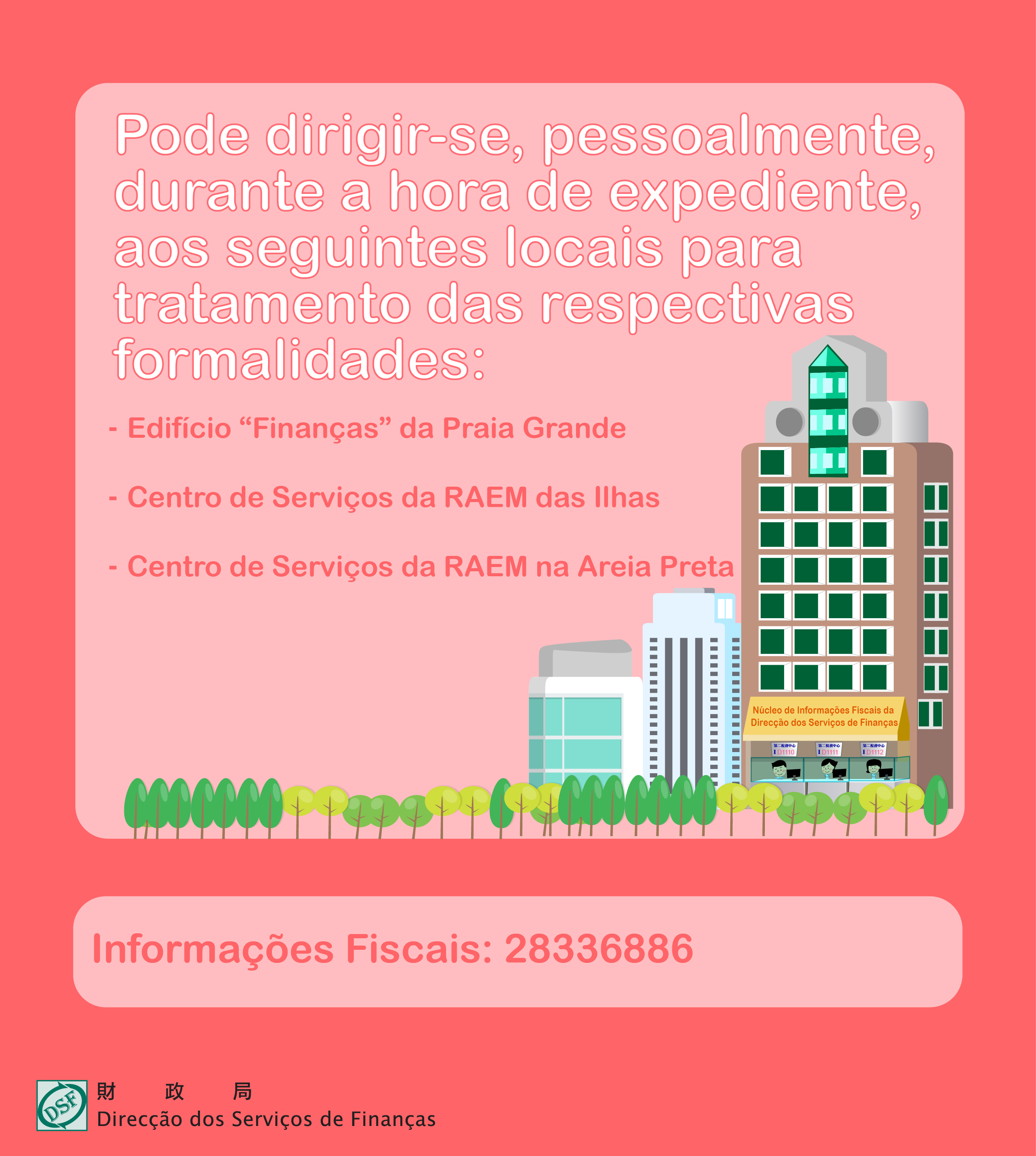 Os contribuintes do Imposto Complementar de Rendimentos do Grupo B, para além de poderem proceder à declaração através da supracitada aplicação “Macau Tax”, podem, também, dirigir-se pessoalmente, na hora de expediente, ao Edifício “Finanças” da Avenida da Praia Grande (2.º Centro de Serviços), ao Centro de Serviços da RAEM das Ilhas ou ao Centro de Serviços da RAEM na Areia Preta, para tratamento das respectivas formalidades e, para consulta, é favor ligar para a linha aberta das Informações Fiscais n.º 28336886.