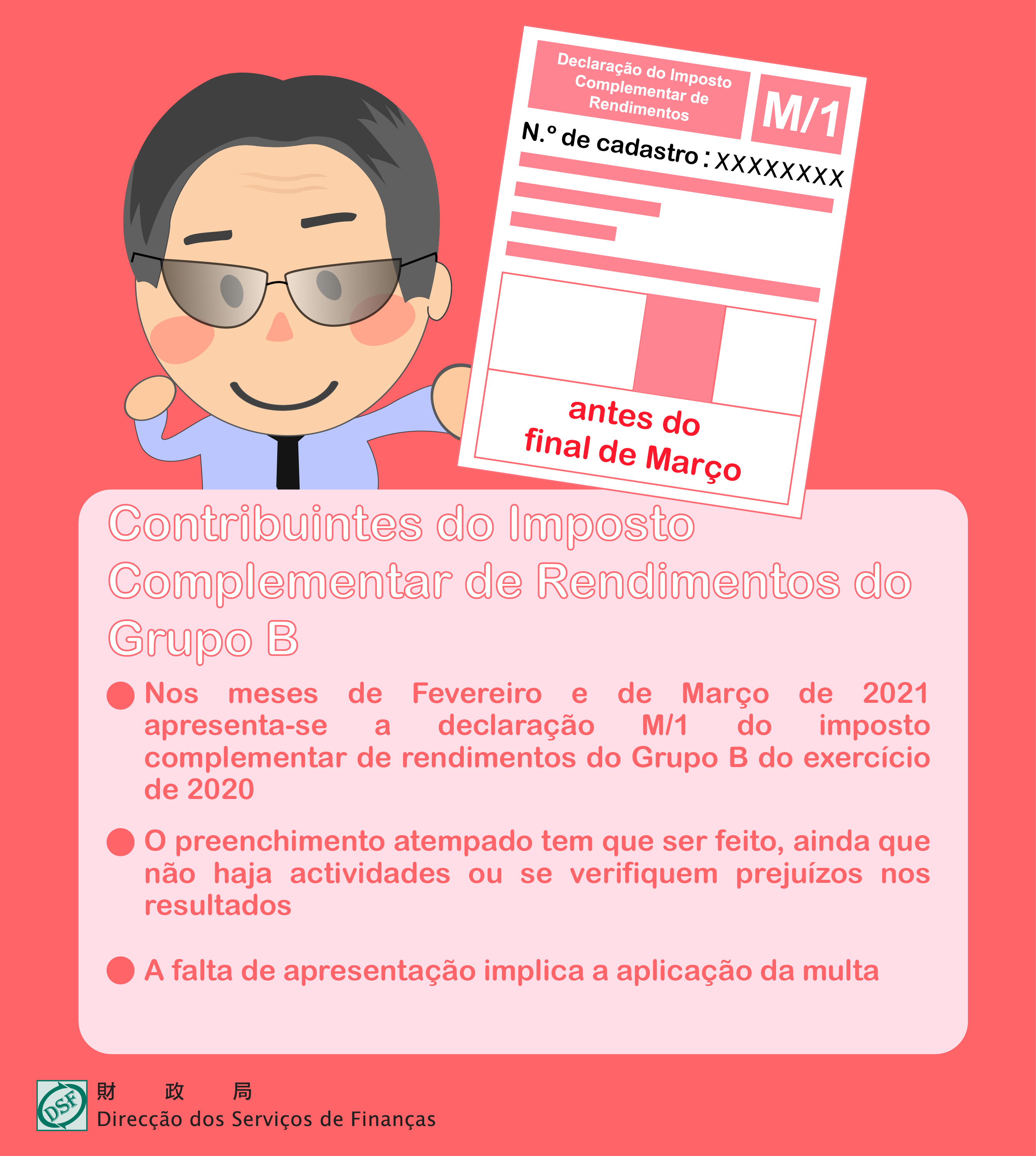 Nos termos previstos no Regulamento do Imposto Complementar de Rendimentos, todos os contribuintes do Grupo B têm que entregar, anualmente, nos meses de Fevereiro a Março, a declaração M/1, para reportar os rendimentos do exercício anterior, mesmo que, nesse exercício, não tenha tido actividades ou tenha verificado prejuízos nos resultados, o seu preenchimento tem que ser feito atempadamente, visto que a falta da sua apresentação implica a aplicação da multa.