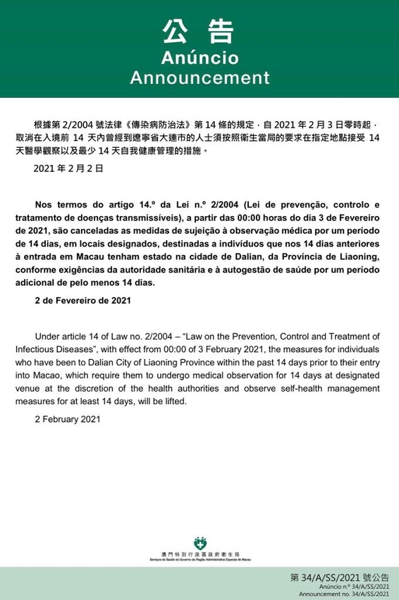 O Centro de Coordenação de Contingência do Novo Tipo de Coronavírus informa que, em resposta à mais recente evolução da situação epidémica na Província de Liaoning, os Serviços de Saúde cancelam, nos termos do artigo 14.º da Lei n.º 2/2004 (Lei de prevenção, controlo e tratamento de doenças transmissíveis), a partir das 00:00 horas do dia 3 de Fevereiro de 2021, as medidas de observação médica por um período de 14 dias, em locais designados, e de autogestão de saúde por um período adicional de pelo menos 14 dias, destinadas aos indivíduos que nos 14 dias anteriores à entrada em Macau tenham estado na Cidade de Dalian, da Província de Liaoning, conforme exigências da autoridade sanitária.