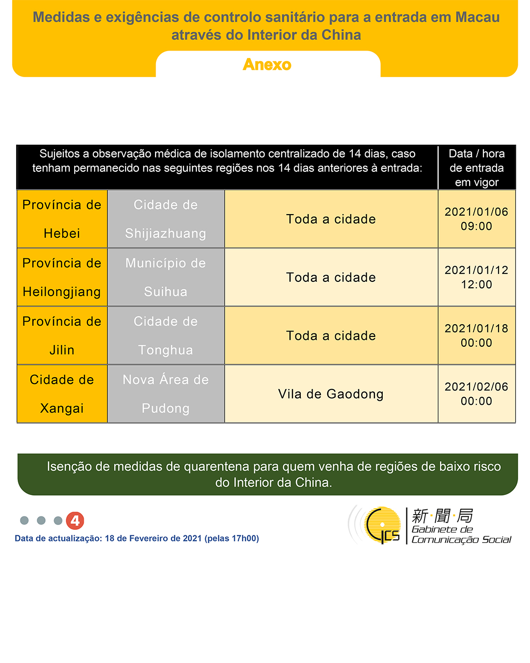 (Infografia) Medidas e exigências de controlo sanitário para a entrada em Macau de indivíduos de diferentes identidades, actualizadas no dia 18 de Fevereiro de 2021