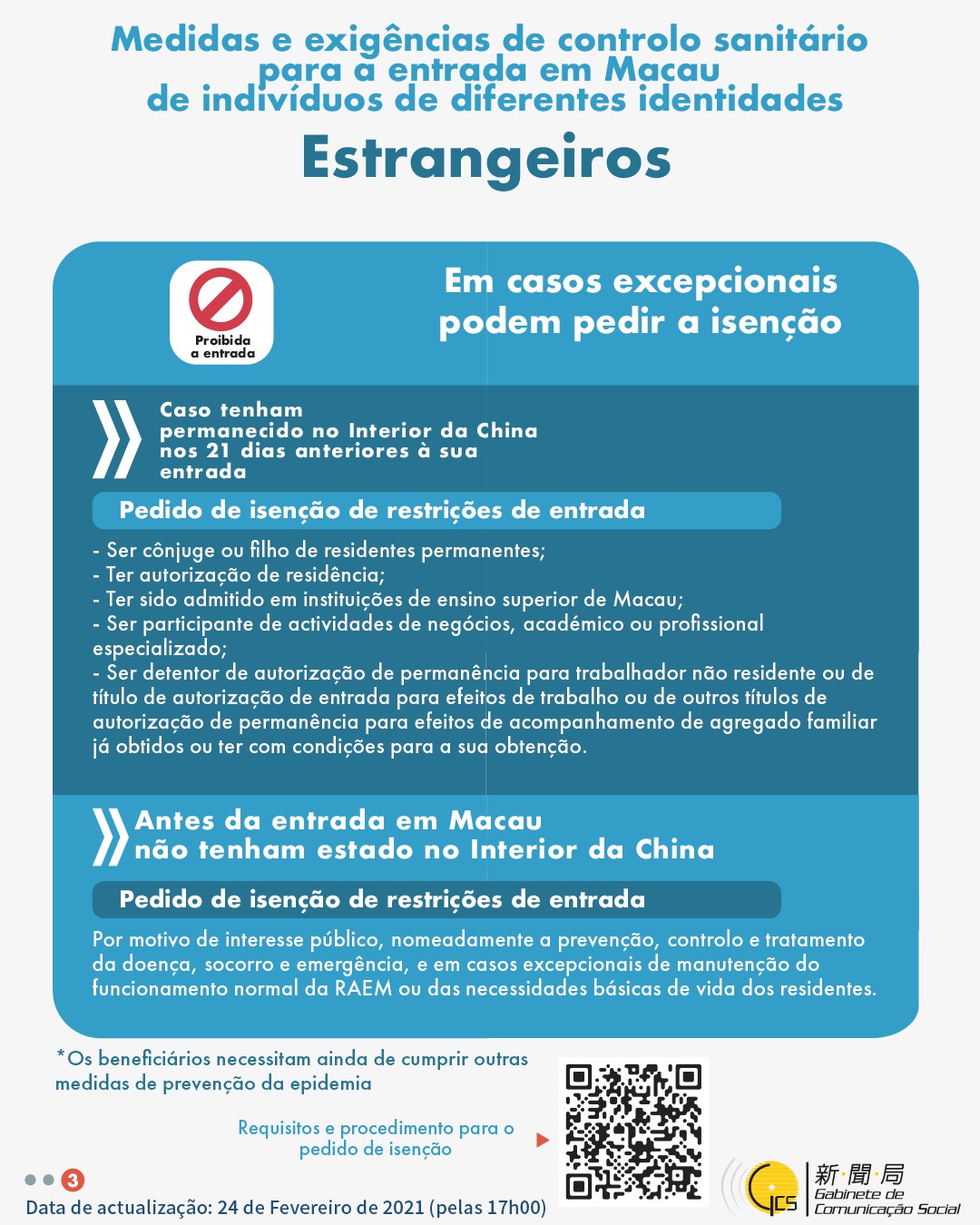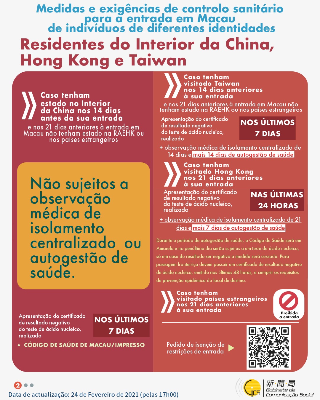 (Infografia) Medidas e exigências de controlo sanitário para a entrada em Macau de indivíduos de diferentes identidades, actualizadas no dia 24 de Fevereiro de 2021