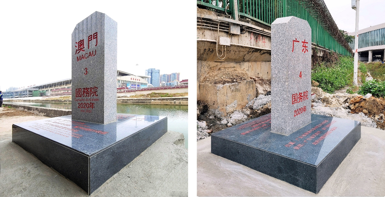 Nos termos do Decreto do Conselho de Estado da República Popular da China n.o 665, de 20 de Dezembro de 2015, que publica o Mapa da Divisão Administrativa da Região Administrativa Especial de Macau da República Popular da China, a delimitação Guangdong-Macau tem um comprimento total de cerca de 3 quilómetros. Assim, tendo em vista à indicação expressa sobre a localização da delimitação da divisão administrativa entre a RAEM e a Cidade de Zhuhai da Província de Guangdong, foram estabelecidos, em 2017, seis marcos ao longo da delimitação terrestre entre Guangdong e RAEM. No entanto, em coordenação com o andamento dos projectos da ligação Zhuhai da Ponte Hong Kong-Zhuhai-Macau e do reordenamento do Canal dos Patos, foram iniciadas em Agosto de 2020, as tarefas do estabelecimento dos restantes marcos n.os 3 e 4 junto ao Canal dos Patos e as mesmas foram concluídas em Dezembro do mesmo ano. Na sequência da conclusão do estabelecimento dos marcos n.os 3 e 4, foram concluídos os trabalhos do estabelecimento de todos os oito marcos ao longo da delimitação Guangdong-Macau, que servem como referência no local para a delimitação da divisão administrativa entre Guangdong e RAEM,o que visa manter a estabilidade harmoniosa nas zonas da delimitação, e promover a cooperação e o desenvolvimento conjunto entre Guangdong e Macau.