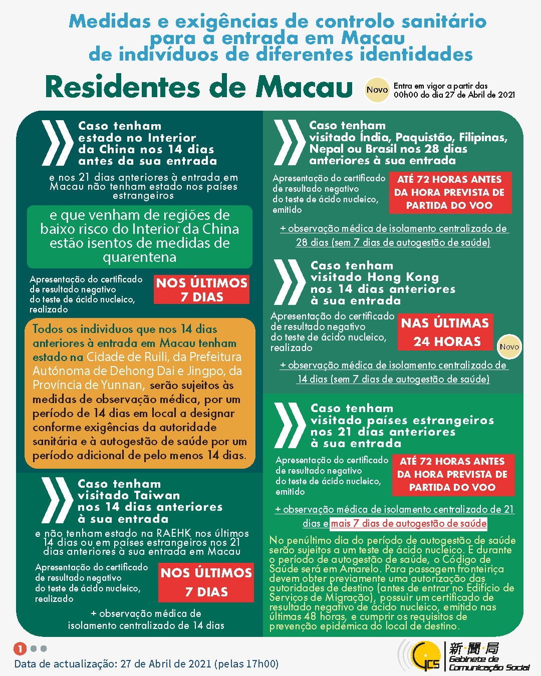 (Infografia)Medidas e exigências de controlo sanitário para a entrada em Macau de indivíduos de diferentes identidades, actualizadas no dia 27 de Abril de 2021