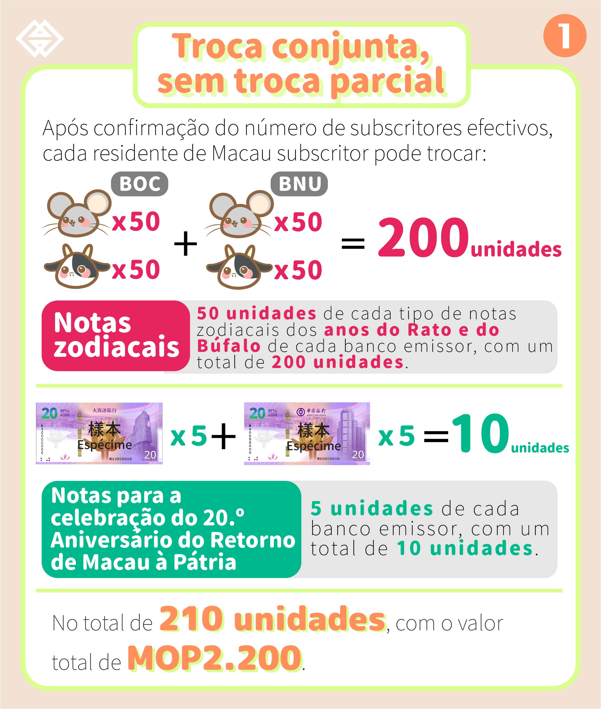 Após confirmação do número de subscritores efectivos, o número de cada tipo de notas zodiacais dos anos do Rato e do Búfalo que cada banco emissor disponibilizará para troca, por cada residente de Macau subscritor, é de 50 (cinquenta) unidades, enquanto que o número de notas para a celebração do 20.º Aniversário do Retorno de Macau à Pátria que cada banco emissor disponibilizará para troca é de 5 (cinco) unidades, pelo que as referidas notas disponíveis para troca totalizam 210 (duzentas e dez) unidades, cujo  valor envolvido ascende a dois mil e duzentas patacas.