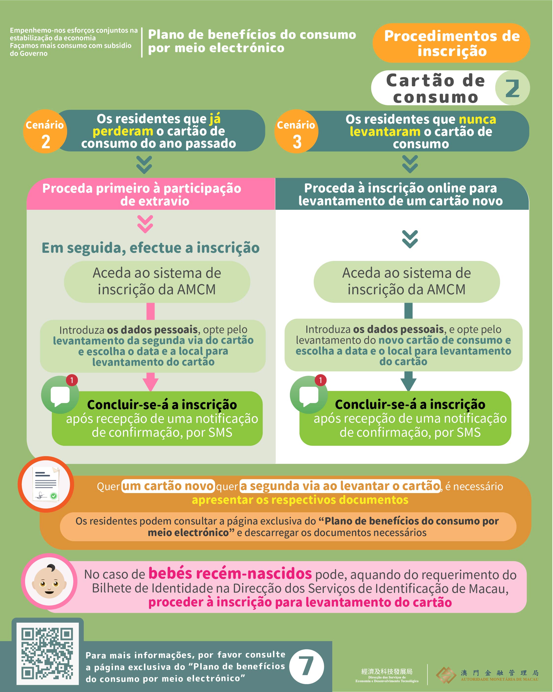 Por outro lado, no caso de optar pela atribuição de benefícios através do cartão de consumo, os residentes podem escolher, directamente, o “cartão de consumo utilizado no ano passado”, aquando da inscrição. Em caso de extravio, os residentes devem denunciar o respectivo extravio junto das autoridades policiais e, posteriormente, efectuar as formalidades para efeitos de emissão de segunda via do cartão. Nas situações em que os residentes nunca tenham levantado o cartão de consumo concedido no ano passado, podem optar pelo levantamento do novo cartão de consumo, mediante uma prévia inscrição. Para os bebés recém-nascidos, os seus pais podem solicitar o novo cartão de consumo, aquando da realização das formalidades referentes ao requerimento do Bilhete de Identidade.