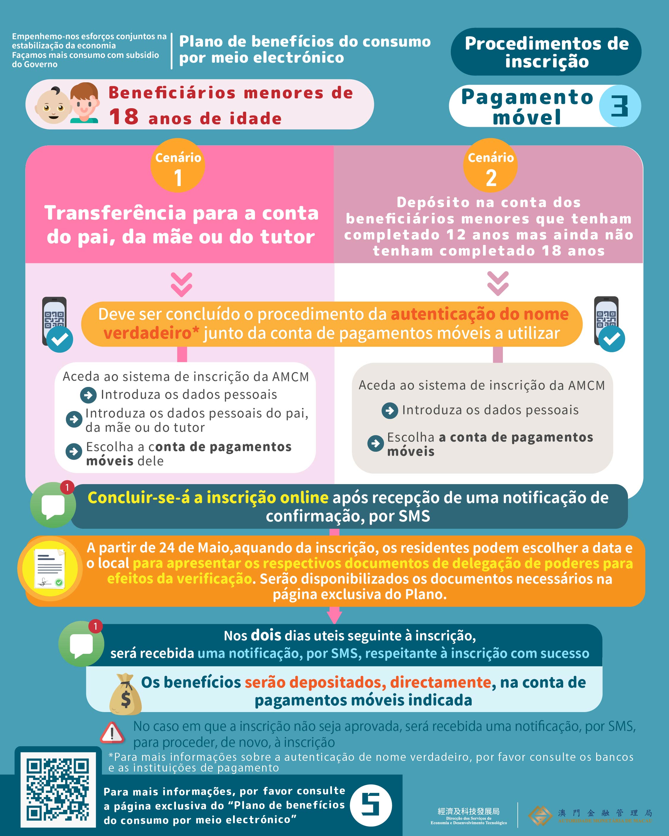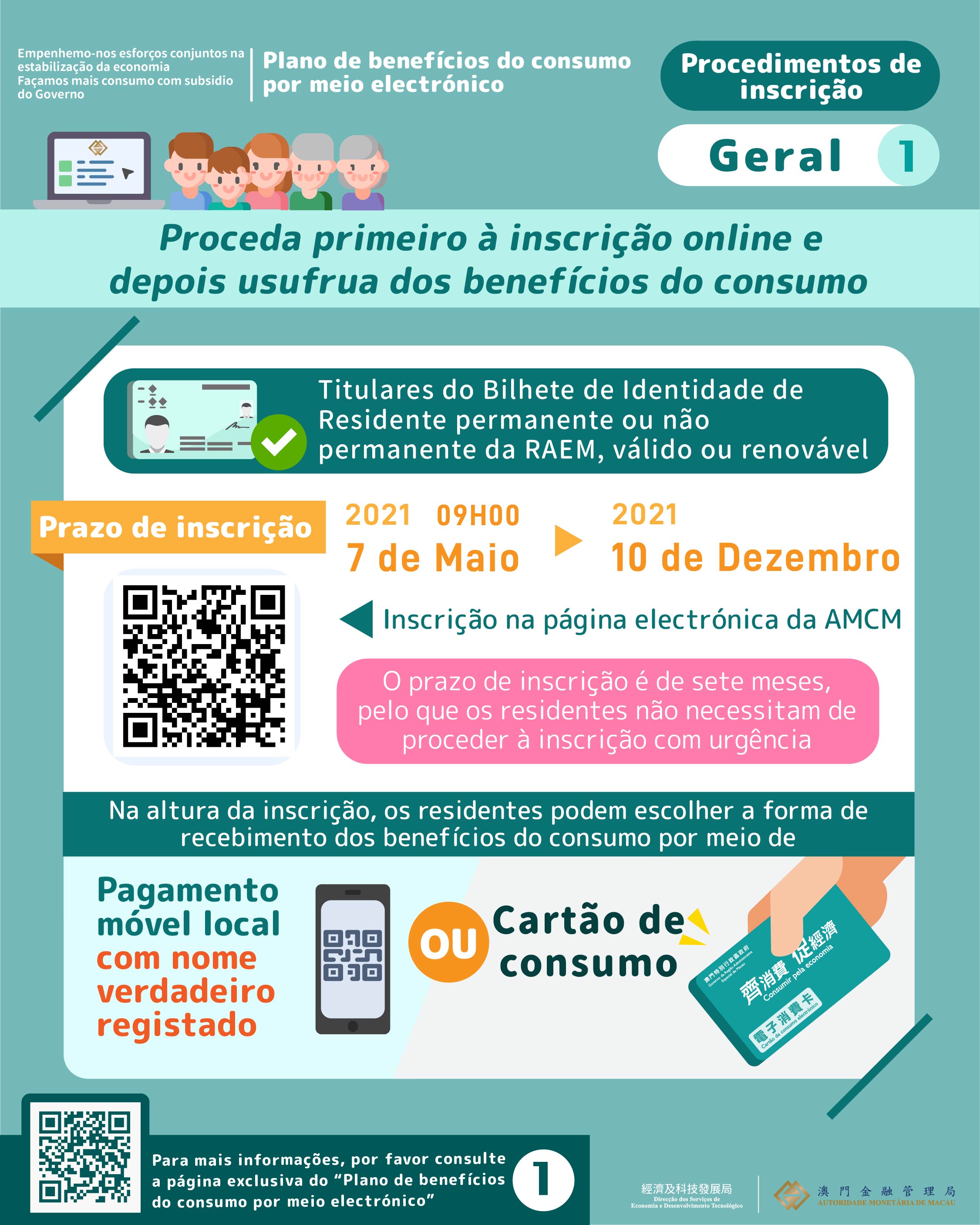Os procedimentos de inscrição são simples, no caso de optar pelo meio de “pagamento móvel”, os residentes devem proceder, previamente, à abertura de uma conta autenticada com nome verdadeiro junto da respectiva instituição financeira participante neste plano. Aquando da realização da inscrição, os residentes podem optar pelo depósito dos benefícios do consumo na sua conta autenticada com nome verdadeiro, ou pela transferência dos benefícios do consumo para a conta autenticada com nome verdadeiro de terceiro; nas situações dos beneficiários menores, os seus benefícios do consumo podem ser transferidos para a conta de pagamento móvel do pai, da mãe ou do tutor. Aliás, nas situações em que os menores de 12 a 17 anos de idade tenham procedido à abertura de uma conta autenticada com o nome verdadeiro, esses podem usufruir dos próprios benefícios, através de uma prévia inscrição.