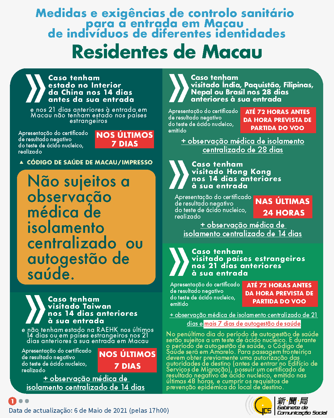 (Infografia)Medidas e exigências de controlo sanitário para a entrada em Macau de indivíduos de diferentes identidades, actualizadas no dia 6 de Maio de 2021