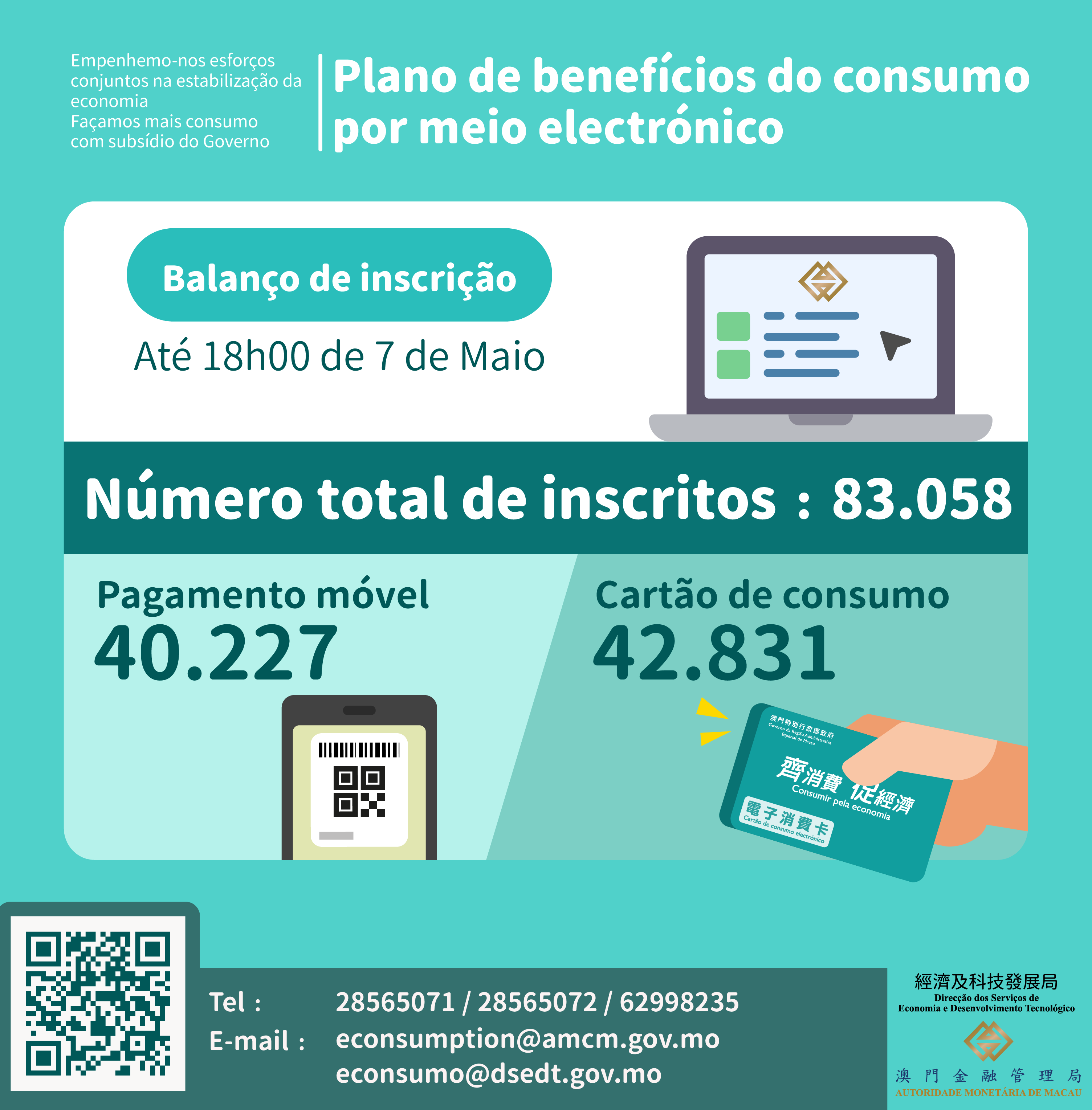 A inscrição online para a obtenção dos “benefícios de consumo por meio electrónico” começou hoje (dia 7) às 9h00, e decorreu de forma suave neste primeiro dia, tendo-se registado, até às 18h00 de hoje, cerca de 83 mil residentes que já concluíram a inscrição, dos quais cerca de 40 mil residentes optaram pela forma de “pagamento móvel” e 43 mil pela forma de “cartão de consumo”.