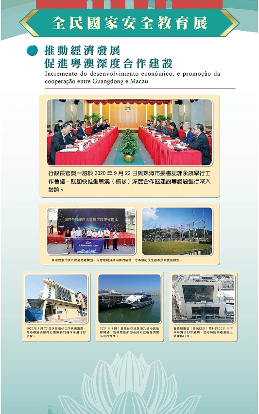 A exibição demonstra também os trabalhos e objectivos impulsionados pelo governo, no último ano, nomeadamente, a economia local, a integração activa no desenvolvimento nacional, bem como, o avanço de uma cooperação profunda entre Guangdong e Macau.
