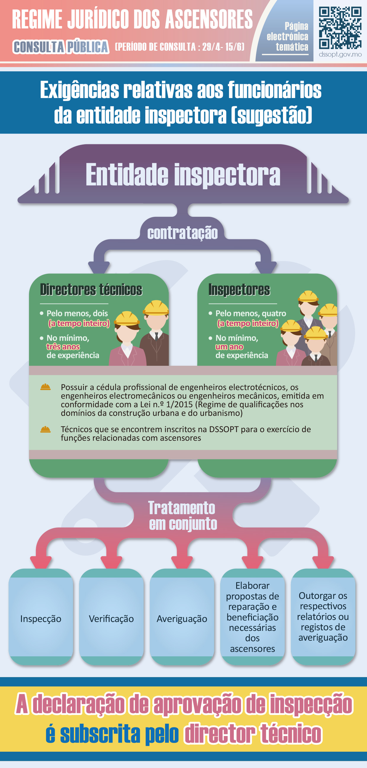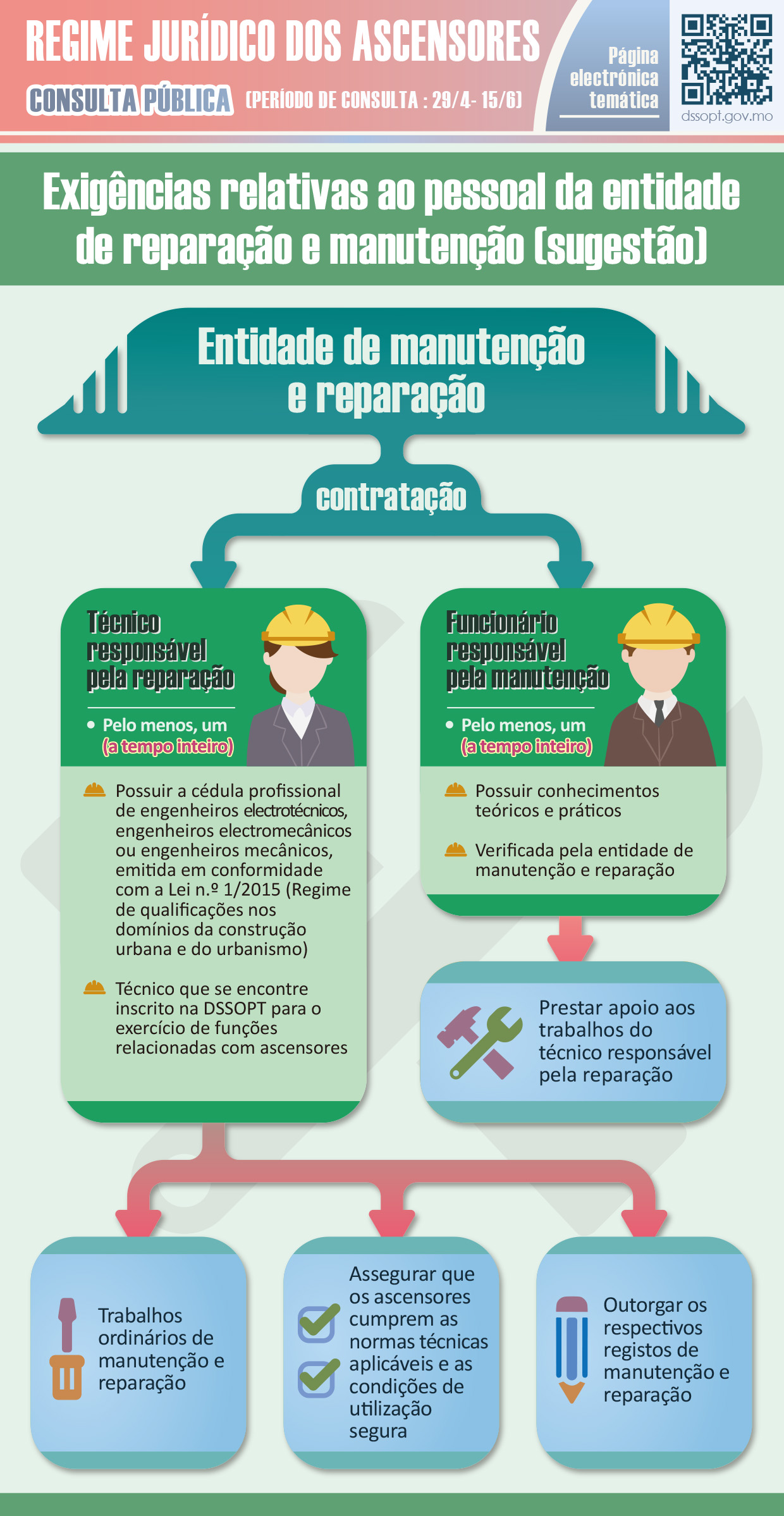 O documento de consulta propõe claramente que os trabalhos de “reparação e manutenção” e de “inspecção” sejam da competência de duas entidades diferentes para que a sua a gestão e fiscalização sejam independentes. A par disso, o documento de consulta propõe que os sócios não possam pertencer ao pessoal técnico do quadro e vice-versa. A fim de elevar o nível profissional do sector, este documento propõe ainda que se estabeleçam as exigências mínimas em relação aos quadros das duas entidades acima referidas, sobretudo no que diz respeito à entidade de manutenção e reparação, cujo quadro deve incluir, pelo menos, um técnico responsável pela reparação e um funcionário responsável pela manutenção, ambos a tempo inteiro, enquanto que no que diz respeito à entidade inspectora, o respectivo quadro deve incluir, pelo menos, dois directores técnicos e quatro inspectores, todos a tempo inteiro. Quanto ao exercício das actividades sobreditas, os seus técnicos devem possuir as habilitações profissionais correspondentes, à excepção dos funcionários responsáveis pela manutenção. Neste momento, estão registados mais de 900 engenheiros especializados nas três áreas que podem exercer as actividades relacionadas com os ascensores, portanto, acreditamos que isto possa satisfazer as necessidades do mercado. Além disso, dado que o volume dos trabalhos dos funcionários responsáveis pela manutenção ainda não aumentou significativamente, prevê-se que a entrada em vigor da lei não terá um impacto nos recursos humanos.