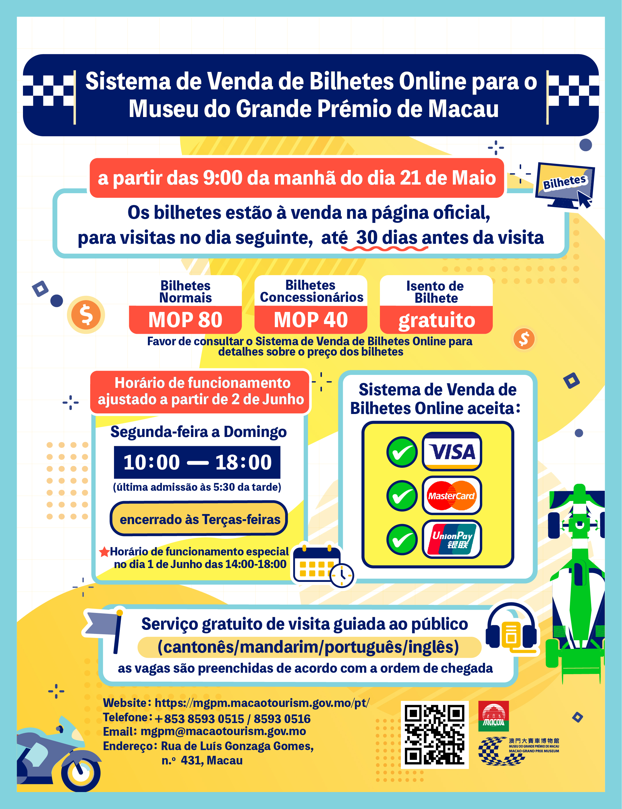O Museu do Grande Prémio de Macau (GPM) abrirá oficialmente a partir de Junho. Para facilitar as visitas dos residentes e visitantes, o museu optimizou o sistema de venda antecipada de bilhetes online na sua página electrónica oficial. A partir das 9h00 de amanhã (dia 21), os bilhetes de entrada podem ser adquiridos online para o dia seguinte, até 30 dias antes da visita.