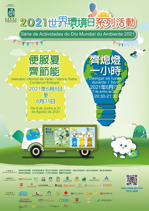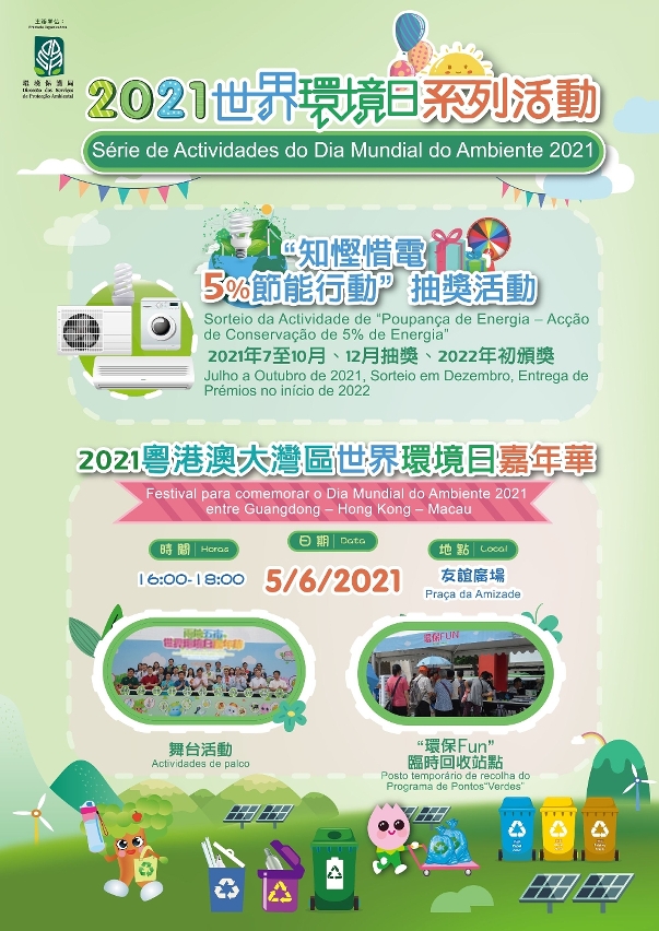 A fim de assinalar o festival internacional de protecção ambiental – “Dia Mundial do Ambiente”, que se realiza anualmente a 5 de Junho, a Direcção dos Serviços de Protecção Ambiental (DSPA) irá lançar a “Série de Actividades do Dia Mundial do Ambiente 2021”, contando com o apoio das cidades da Grande Baía Guangdong-Hong Kong-Macau. As referidas actividades abrangem “Desligar as luzes durante 1 hora”, “Vestuário Informal de Verão – Vamos Todos Conservar Energia!”, o Sorteio da Actividade de “Poupança de Energia – Acção de Conservação de 5% de Energia”, e o “Festival para comemorar o Dia Mundial do Ambiente 2021 entre Guangdong-Hong Kong-Macau”, a organizar no dia 5 de Junho, por forma a aumentar a consciencialização dos cidadãos para a valorização da protecção do ambiente e a incentivar a conservação energética e a redução de emissões.