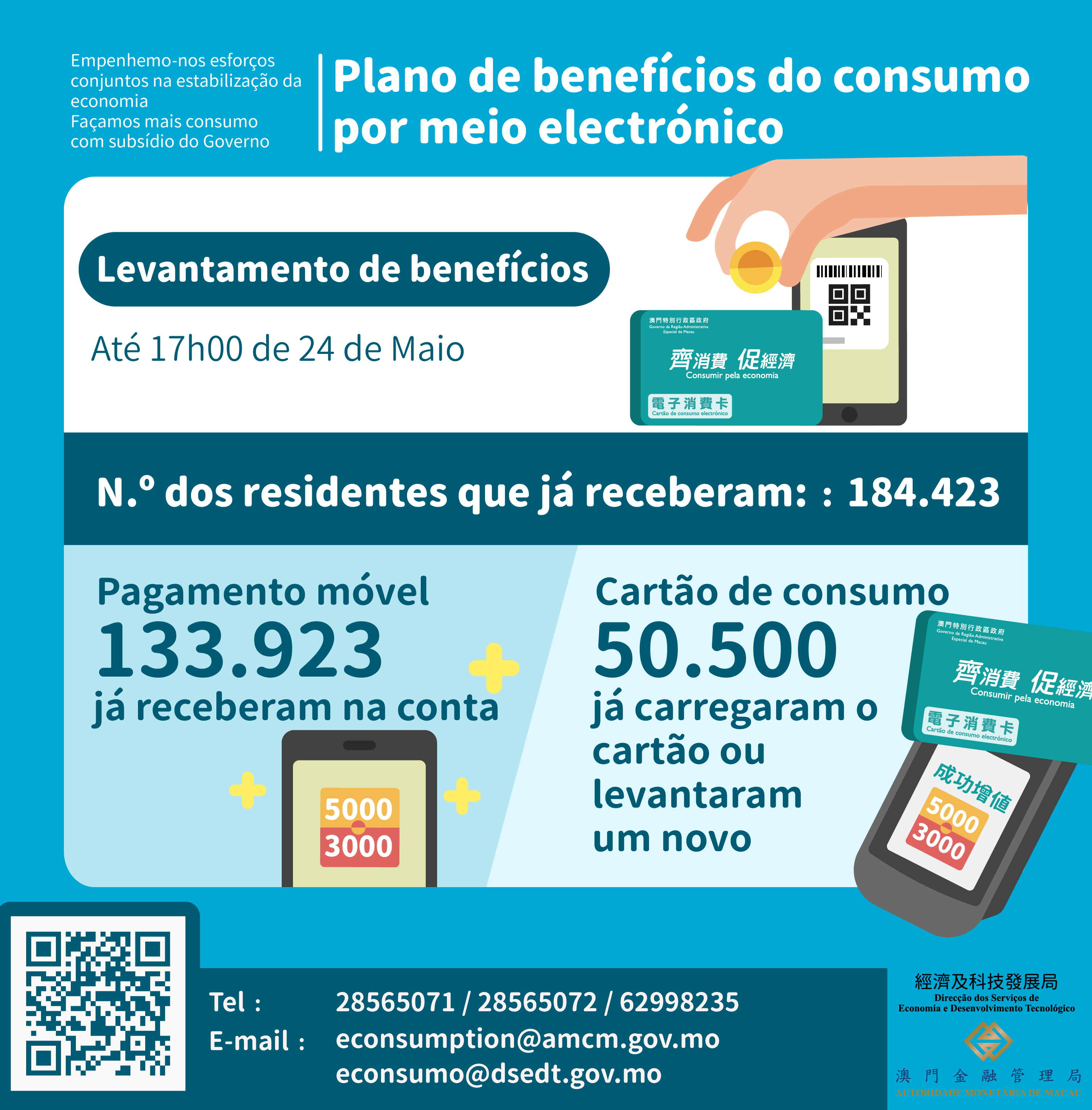 Hoje (dia 24) foi o primeiro dia do levantamento dos benefícios de consumo por meio electrónico. Até 17H00, mais de 184 000 residentes já receberam os benefícios, tendo o processo de levantamento decorrido sem problemas em geral. De entre estes residentes, mais de 50 000 já concluíram o carregamento do cartão de consumo ou já levantaram o novo cartão. Além disso, os cerca de 134 000 residentes que tenham concluído a inscrição antes de 20 de Maio, já receberam praticamente os benefícios através da transferência automática.