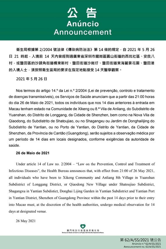 O Centro de Coordenação de Contingência do Novo Tipo de Coronavírus informa que tendo em consideração a evolução epidemiológica mais actualizada da Cidade de Shenzhen, nos termos do artigo 14.º da Lei n.º 2/2004 (Lei de prevenção, controlo e tratamento de doenças transmissíveis), a partir das 21:00 horas do dia 26 de Maio de 2021, todos os indivíduos que nos 14 dias anteriores à entrada em Macau tenham estado na Comunidade de Xikeng ou 8.ª Vila de Anliang, do Subdistrito de Yuanshan, do Distrito de Longgang da Cidade de Shenzhen, bem como na Nova Vila de Qiaodong, do Subdistrito de Shatoujiao, ou no Shagangxu ou Jardim de Donghailijing do Subdistrito de Yantian, ou no Porto de Yantian, do Distrito de Yantian, da Cidade de Shenzhen, serão sujeitos a medidas de observação médica por um período de 14 dias em local a designar conforme exigências da autoridade sanitária.