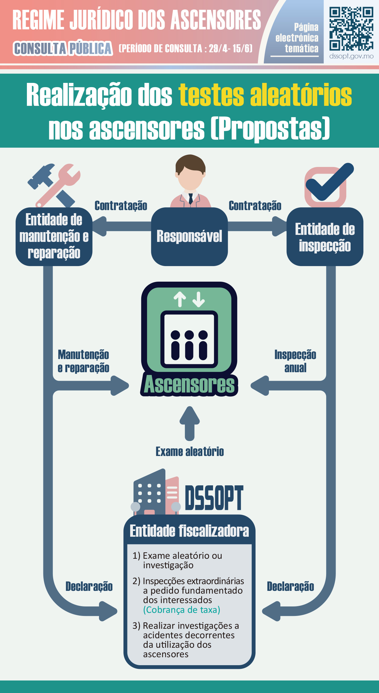 Sendo o objectivo deste regime elevar a segurança dos ascensores, para além da proposta de funcionamento independente da entidade de manutenção e reparação e da entidade inspectora, a DSSOPT irá desempenhar funções de entidade fiscalizadora, com direito a realizar testes aleatórios nos ascensores ou testes extraordinários a pedido de interessados e a realizar investigações a acidentes decorrentes da utilização dos ascensores. Ao mesmo tempo, as entidades inspectoras existentes no mercado têm de aceitar obrigatoriamente que a DSSOPT seja nomeada como uma terceira entidade independente para executar os trabalhos sobreditos.