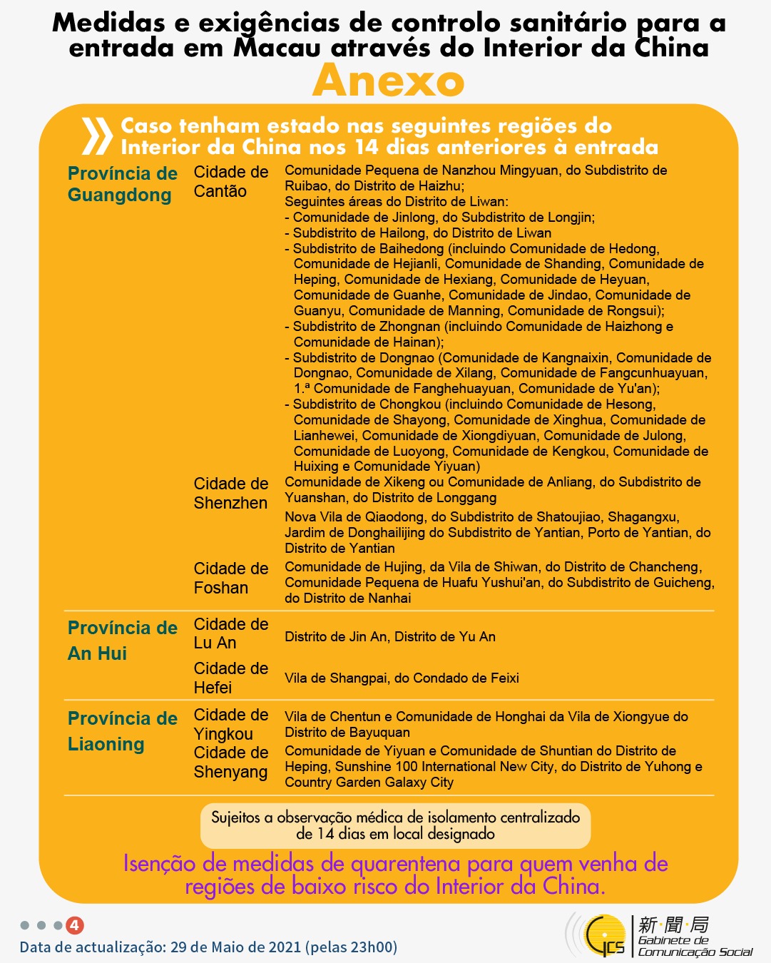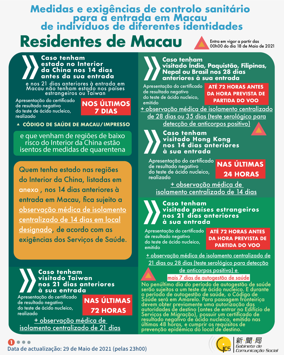 (Infografia)Medidas e exigências de controlo sanitário para a entrada em Macau de indivíduos de diferentes identidades, actualizadas no dia 29 de Maio de 2021