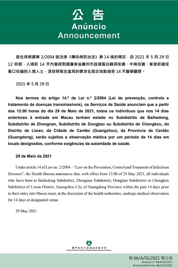 O Centro de Coordenação de Contingência do Novo Tipo de Coronavírus informa que tendo em consideração a evolução epidemiológica mais actualizada da Cidade de Cantão da Província de Cantão (Guangdong), nos termos do artigo 14.º da Lei n.º 2/2004 (Lei de prevenção, controlo e tratamento de doenças transmissíveis), a partir das 12:00 horas do dia 29 de Maio de 2021, todos os indivíduos que nos 14 dias anteriores à entrada em Macau tenham estado no Subdistrito de Baihedong (incluindo Comunidade de Hedong, Comunidade de Hejianli, Comunidade de Shanding, Comunidade de Heping, Comunidade de Hexiang, Comunidade de Heyuan, Comunidade de Guanhe, Comunidade de Jindao, Comunidade de Guanyu, Comunidade de Manning, Comunidade de Rongsui), Subdistrito de Zhongnan (incluindo Comunidade de Haizhong e Comunidade de Hainan), Subdistrito de Dongnao (Comunidade de Kangnaixin, Comunidade de Dongnao, Comunidade de Xilang, Comunidade de Fangcunhuayuan, 1.ª Comunidade de Fanghehuayuan, Comunidade de Yu'an), Subdistrito de Chongkou (incluindo Comunidade de Hesong, Comunidade de Shayong, Comunidade de Xinghua, Comunidade de Lianhewei, Comunidade de Xiongdiyuan, Comunidade de Julong, Comunidade de Luoyong, Comunidade de Kengkou, Comunidade de Huixing e Comunidade Yiyuan), do Distrito de Liwan, da Cidade de Cantão (Guangzhou), da Província de Cantão (Guangdong), serão sujeitos a medidas de observação médica por um período de 14 dias em local a designar conforme exigências da autoridade sanitária.