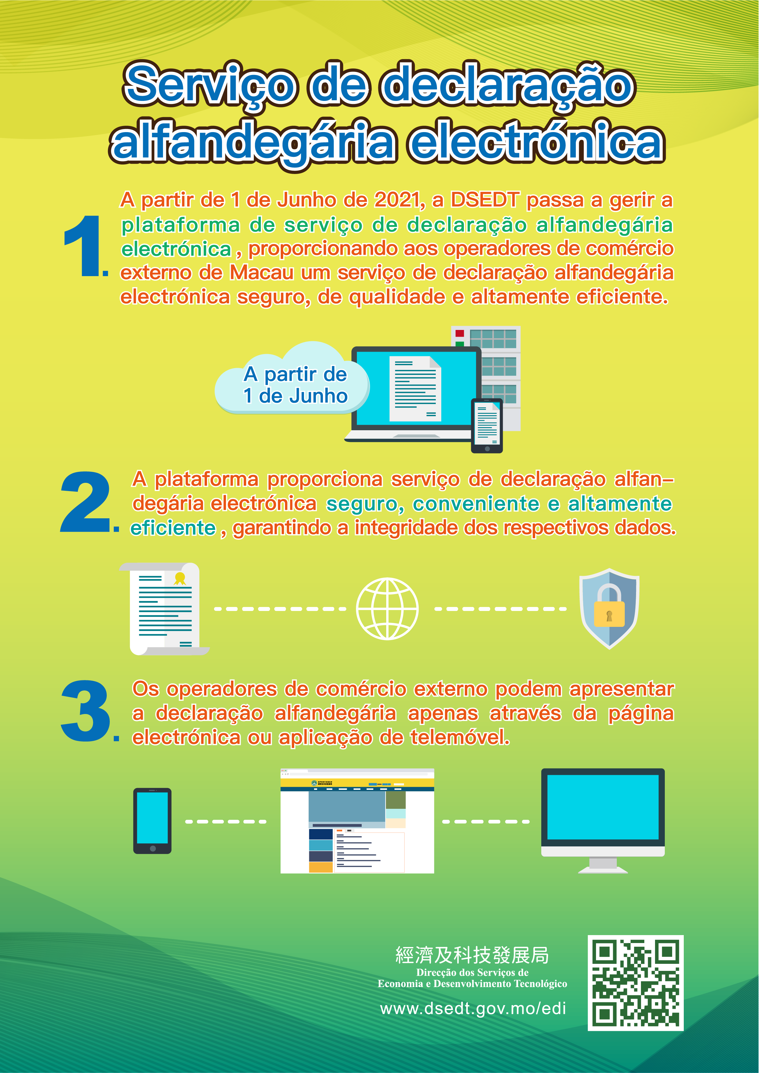 A DSEDT vai, a partir de amanhã (dia 1), gerir plenamente a plataforma de declaração alfandegária electrónica (EDI), originalmente operada pela Transferência Electrónica de Dados - Macau EDI VAN, S.A, sendo o novo website da plataforma (https://eservice.edi.gov.mo/ecustoms) inaugurado oficialmente no mesmo dia. O novo plataforma, adaptando-se aos hábitos de uso actuais dos utilizadores empresariais de declaração alfandegária electrónica, proporciona todas as mesmas funções existentes referentes à declaração alfandegária electrónica, mantendo-se inalterável o procedimento de pedido de declaração alfandegária, na tentativa de continuar a fornecer serviços públicos seguros, eficientes e expeditos aos operadores do comércio externo de Macau.