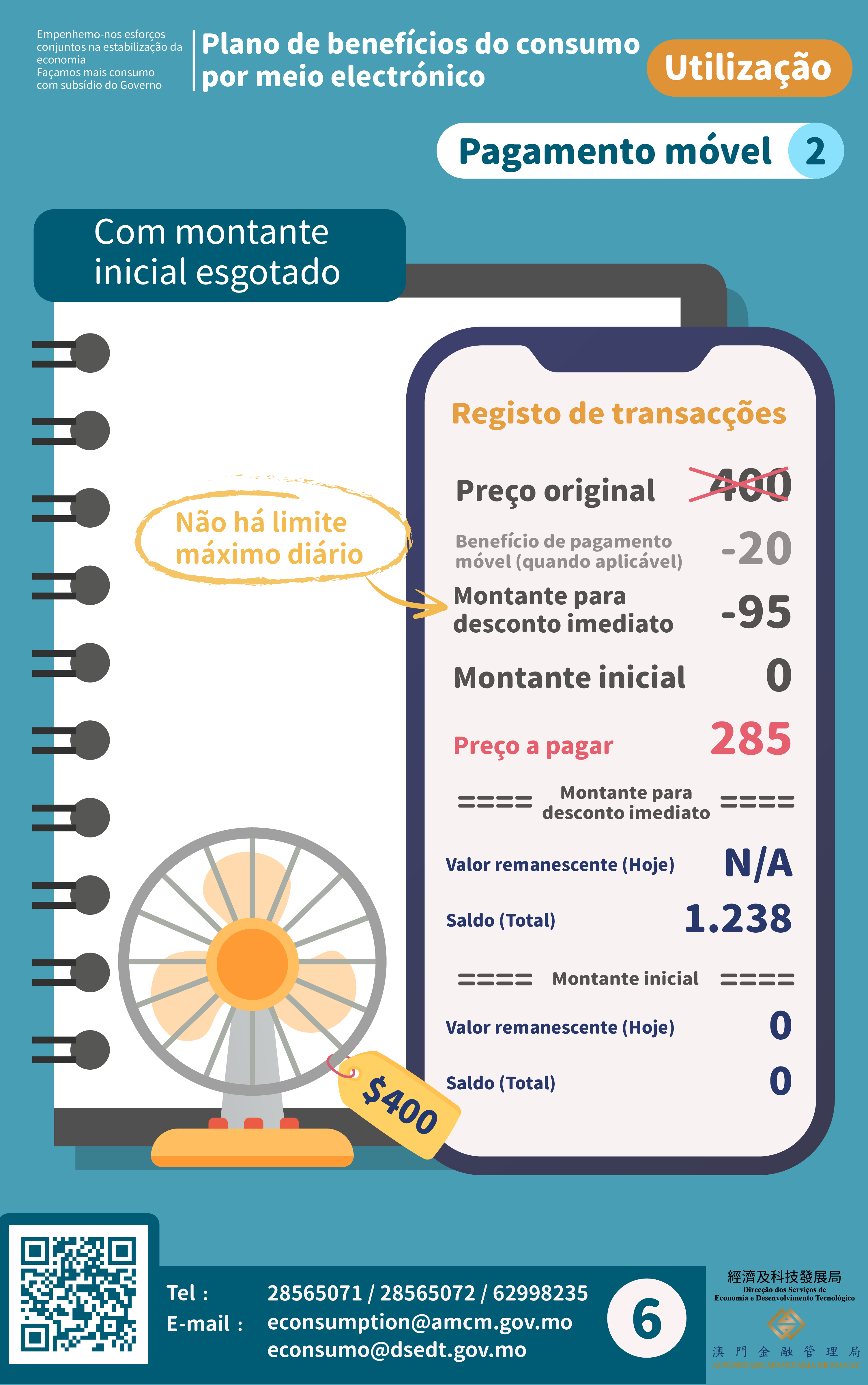 Após esgotado o “montante inicial” de 5 000 patacas e, tendo ainda saldos no “montante para desconto imediato”, os residentes podem, por iniciativa própria, proceder ao carregamento de dinheiro para que possam continuar a beneficiar de descontos de 25%, deixando de vigorar, nessa altura, o limite máximo diário anteriormente estipulado, aquando da utilização desse dinheiro, até que o montante para desconto imediato seja totalmente usado. E para os residentes que optaram receber por meio do “cartão de consumo”, quando o “montante inicial” restar 10 patacas ou menos, podem, por iniciativa própria, proceder ao carregamento de dinheiro de acordo com as suas necessidades.