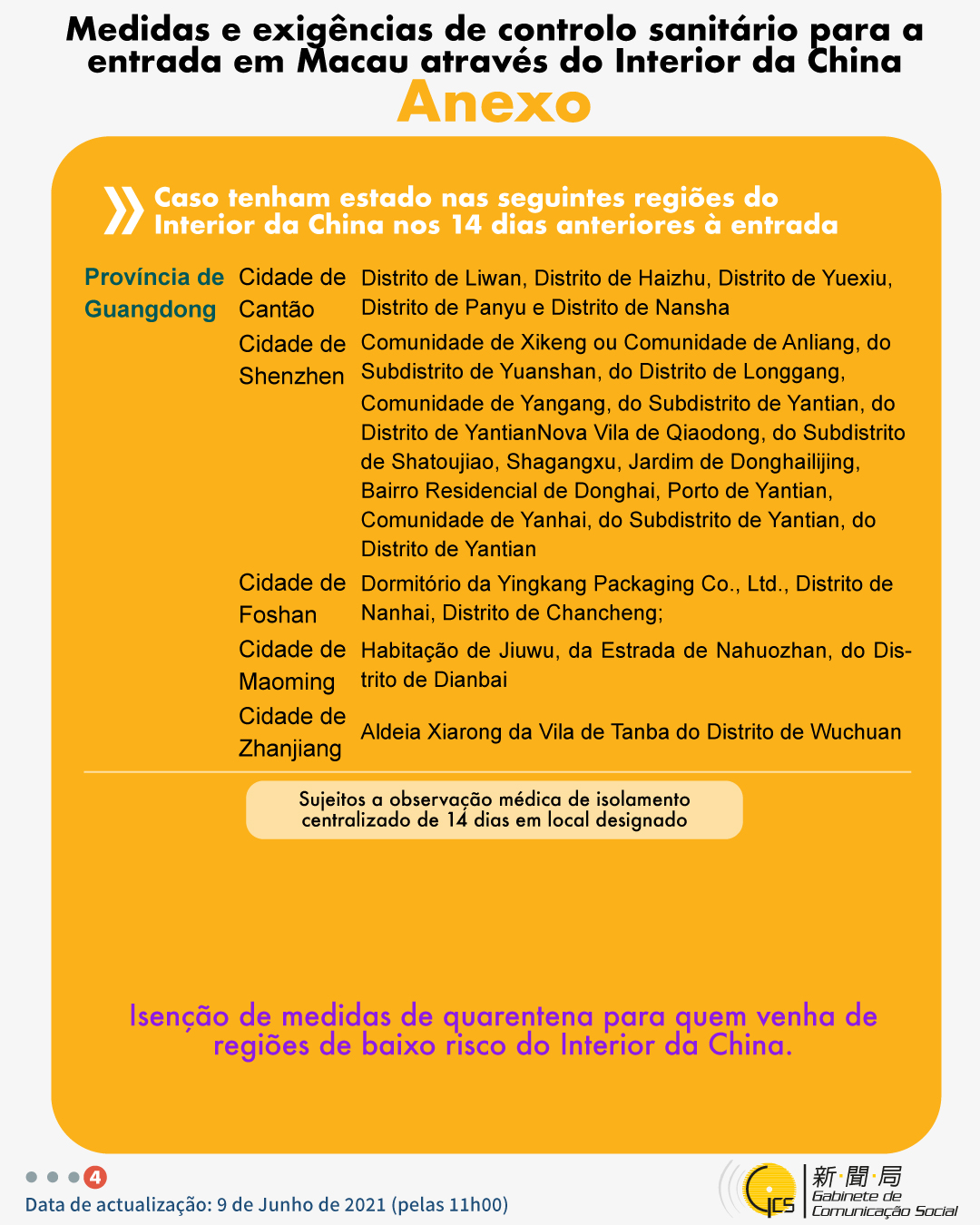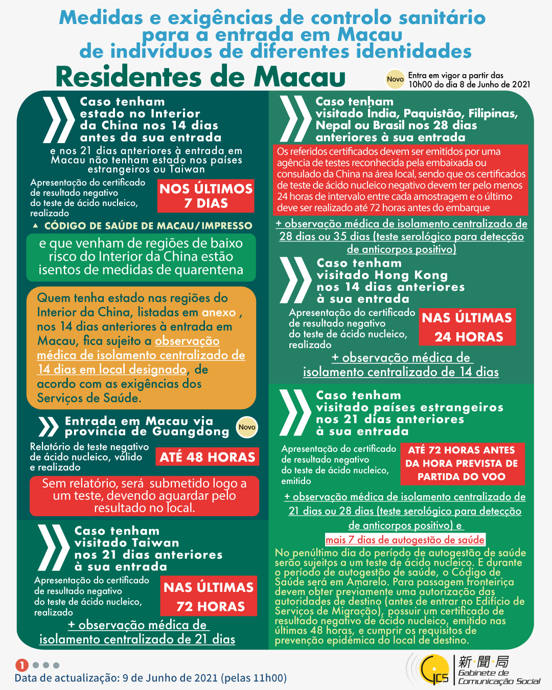 (Infografia)Medidas e exigências de controlo sanitário para a entrada em Macau de indivíduos de diferentes identidades, actualizadas no dia 9 de Junho de 2021