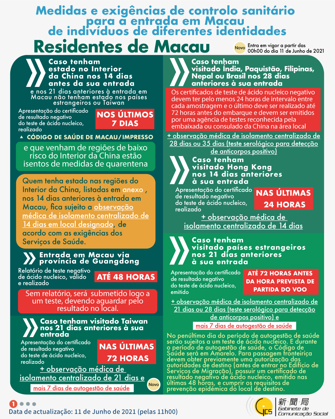 (Infografia)Medidas e exigências de controlo sanitário para a entrada em Macau de indivíduos de diferentes identidades, actualizadas no dia 11 de Junho de 2021