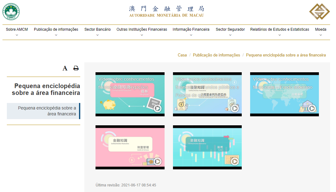 Na primeira fase, os vídeos dos “Conhecimentos financeiros” consistem em temas sobre “Obrigações”, “Fundos públicos e Fundos de oferta privada”, “Fundo soberano”, “Gestão de fortunas” e “Acções”, os quais foram disponibilizados na coluna específica de “Pequena enciclopédia sobre a área financeira” na página electrónica da AMCM (https:// https://www.amcm.gov.mo/pt/news-and-announcements/cyclopedia).