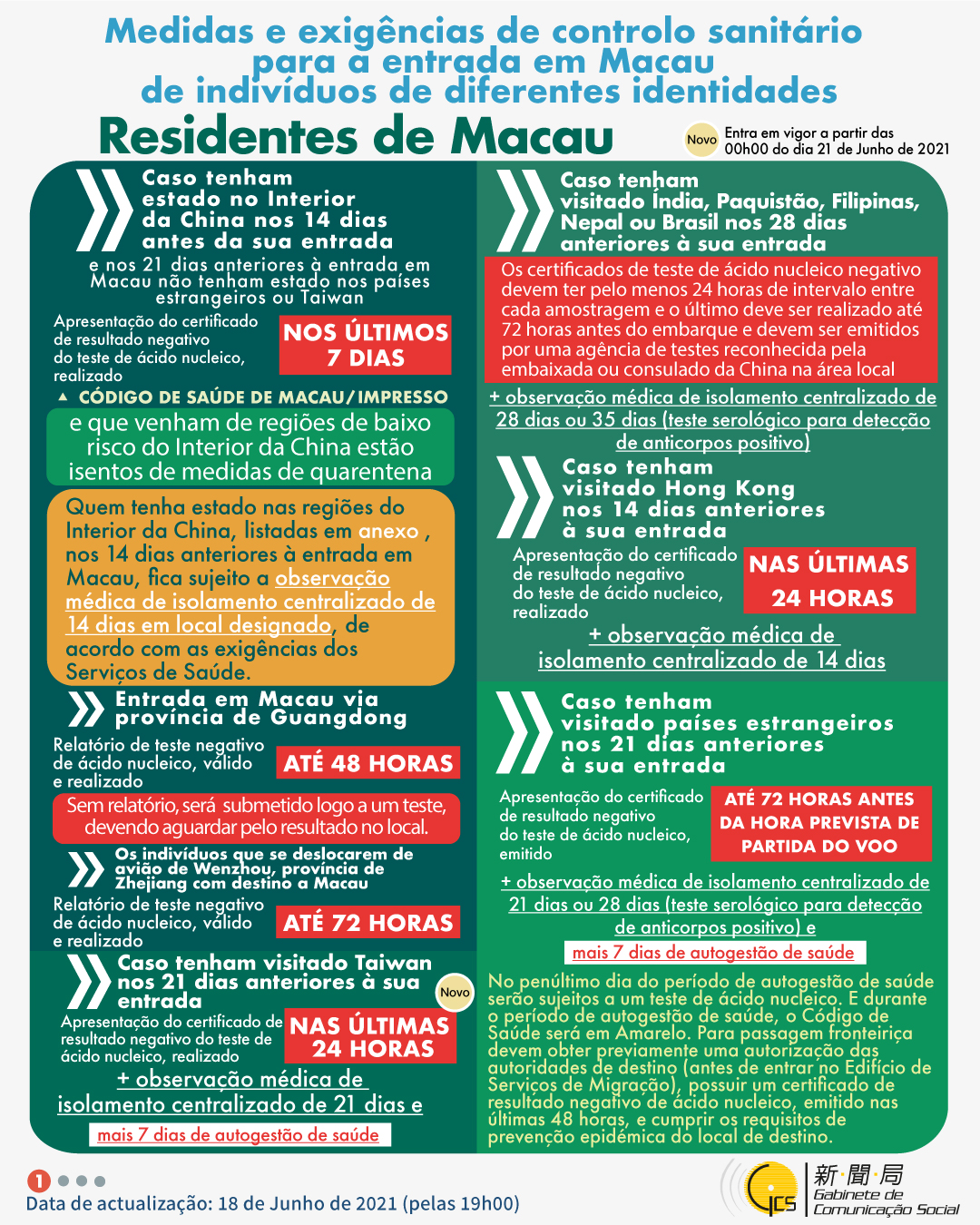 (Infografia)Medidas e exigências de controlo sanitário para a entrada em Macau de indivíduos de diferentes identidades, actualizadas no dia 18 de Junho de 2021