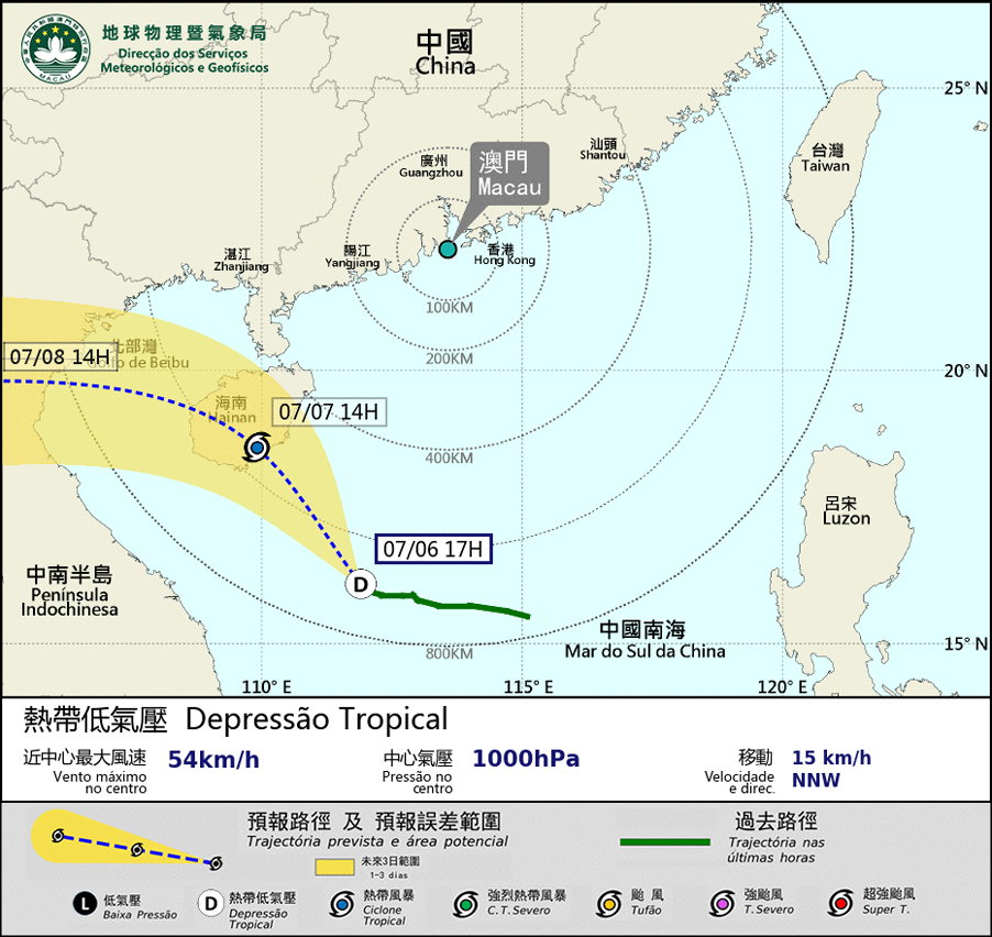 A depressão tropical localizada no Estreito de Taiwan enfraqueceu e dissipou-se esta tarde. Entretanto, outra depressão tropical localizada na parte central do Mar do Sul da China vai intensificar-se hoje e amanhã e continuar em direcção noroeste. Amanhã de manhã, o sistema vai deslocar-se, genericamente, para a Ilha Hainan. Dado que a depressão tropical se mantém a uma distância determinada de Macau, hoje a possibilidade de emitir o sinal mais alto é baixa. Ao mesmo tempo, Macau não está de momento influenciado por marés astronómicas. A possibilidade de ocorrer “Storm Surge”é baixa.
