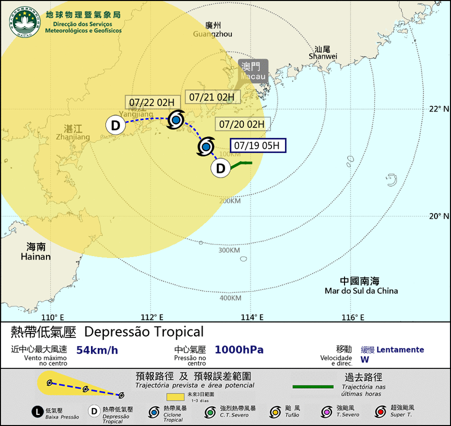 A depressão tropical localizada na parte norte do Mar do Sul da China tem uma dimensão relativamente pequena, no entanto, esta mantêm-se a uma distância relativamente próxima, e pode ainda intensificar-se. Espera-se que a circulação relacionada com o sistema traga tempo instável para Macau. Nos próximos dias, o vento na região vai intensificar-se, havendo aguaceiros fortes. Esta Direcção continua a acompanhar os desenvolvimentos. Por outro lado, nos dias 19 e 20, apesar de Macau não estar de momento influenciado por marés astronómicas, a população deve ficar atenta à possibilidade de inundações causadas por chuvas fortes.