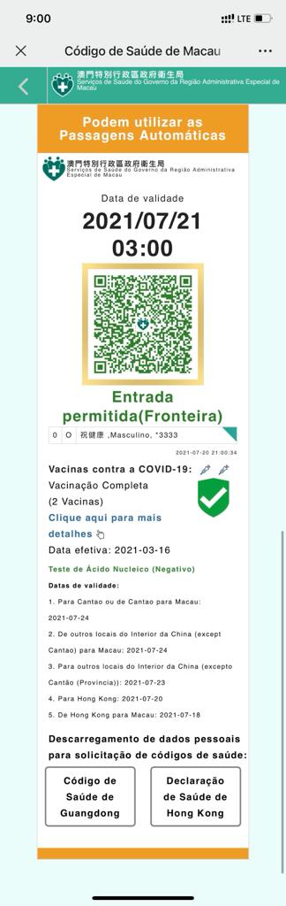 Para destacar as pessoas que já concluíram o processo de vacinação contra a COVID‑19 o Centro de Coordenação de Contingência do Novo Tipo de Coronavírus informa que a partir das 00H00 horas do dia 21 de Julho, será adicionada uma moldura dourada na parte exterior do Código QR do “Código de Saúde”, das pessoas que já tenham ultrapassado 14 dias após a vacinação. Será exibido, ainda, na parte inferior do código (lugar onde se coloca o registo de vacina), a expressão “Vacinação concluída(2 Vacinas)”.